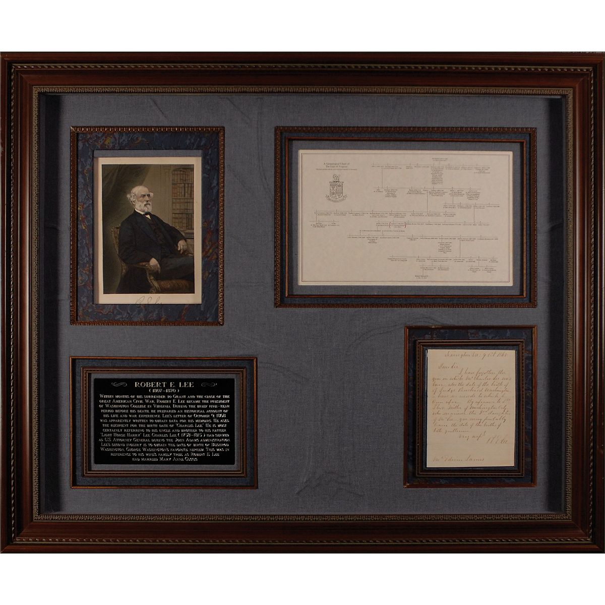ALS signed “R. E. Lee,” one page, lightly-lined, 5 x 6.5, October 9, 1868. Letter to Mr. Edwin James. In full: “I have forgotten the year in which Mr. Charles Lee was born, also the date of the birth of Judge Bushrod Washington, I have no records to which I can refer. By reference to Dr. Thos: Miller of Washington City who married the 2nd daughter of Mr. Lee, you may probably learn the date of the births of both gentlemen.” Elaborately triple matted and framed by the Kenneth R. Laurence Galleries with a color engraved portrait of Lee, a “Genealogy Chart of the Lees of Virginia,” and a descriptive plaque, with a subtle embossed ‘Tree of Life’ in the mat, to an overall size of 34.5 x 28.25. In fine condition, with a mild overall shade of toning to letter from previous display.