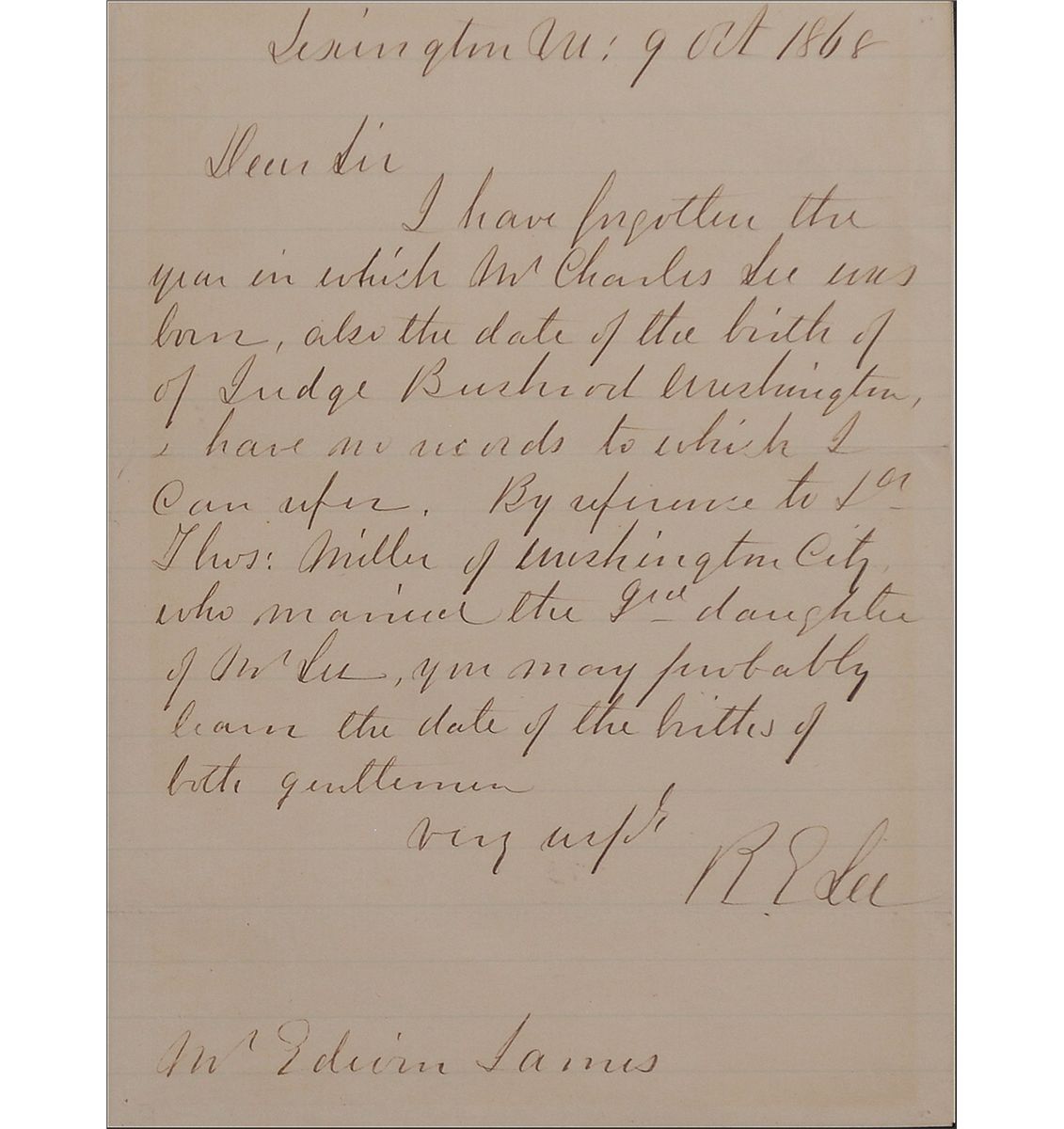 Within months of his surrender to Grant and the close of the Civil War, Robert E. Lee became the President of Washington College in Virginia, where he would remain until his death five years later. During this time, he prepared a historical account of his life, working hard to leave behind clear and accurate genealogical records: Lee’s letter of October 9, 1868 was seemingly written to obtain data for this project. He asks the recipient for the birth date of “Charles Lee,” most certainly referring to his uncle, brother of R. E.’s father “Light Horse Harry” Lee. Charles Lee (1758-1815) was appointed U. S. Attorney General by President Washington in 1795, a post at which he remained until the end of John Adams’s term in 1801. Lee’s second inquiry is to obtain the date of birth of Bushrod Washington, George Washington’s favorite nephew, an Associate Justice of the U. S. Supreme Court for over 30 years. This request was in reference to his wife, Martha Washington’s great-granddaughter, Mary Anna Custis’ lineage. Working to create a clear account of his life and family tree, this letter gives us a glimpse into the topic that occupied the great general’s mind during his final years.