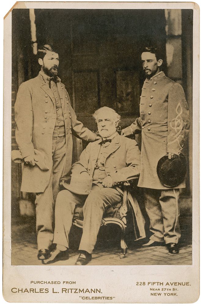 Original 4.25 x 6.5 cabinet photo of Lee with his son, G. W. Custis Lee, to his left, and Col. Walter Taylor to his right, by Charles L. Ritzmann of New York. Light silvering to dark areas of the image and some paper loss to upper left corner of mount, otherwise fine condition.