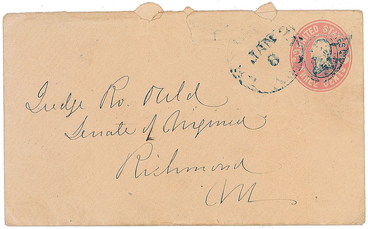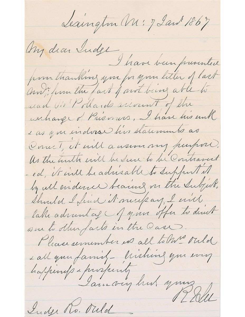 ALS signed “R. E. Lee,” one page, lightly-lined, 5 x 8, Lexington, Virginia, January 7, 1867. Letter to Judge Ro. Ould. In full: “I have been prevented from thanking you for your letter of last Nobr. from the fact of not being able to read Mr. Pollard's account of the exchange of Prisoners. I have his work & as you endorse his statements as correct, it will answer my purpose. As the truth will be sure to be controverted, it will be advisable to support it by all evidence bearing on the subject. Should I find it necessary, I will take advantage of your offer to direct me to other facts in the case.” In fine condition, with a crease to the lower left and a tiny area of toning to the upper left. Accompanied by the original mailing envelope, addressed in Lee’s hand.