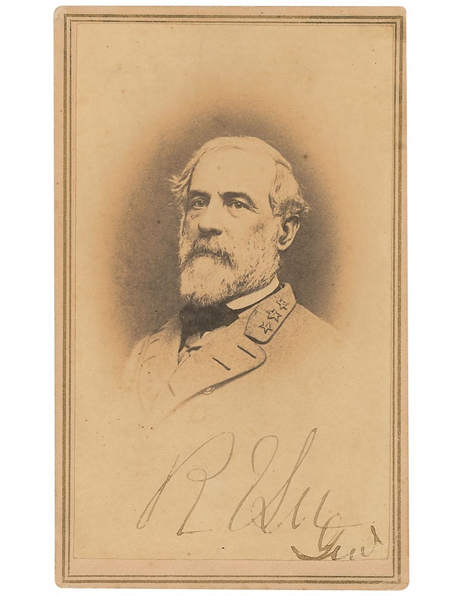 Superb original 2.25 x 4 carte-de-visite photo by Vannerson and Jones of Richmond, Virginia, signed below the image in black ink, “R. E. Lee, Genl.” A presentation inscription on the reverse reads, “Norman Walker from his rebel cousin David Walker.” In fine condition, with a couple trivial creases to lower right corner, one through the end of Lee’s rank. The three-quarter length photograph of Robert E. Lee, from which this oval bust image was taken, is in the Prints and Photographs Division of the Library of Congress which identifies the photographer as Jules Vannerson and the “Date Created/Published” as “1864 March.” On October 2, 1865, Lee was inaugurated as President of Washington College, Lexington, Virginia. A fantastic example and dignified image of Lee, who is quite elusive in signed portraits from any period.