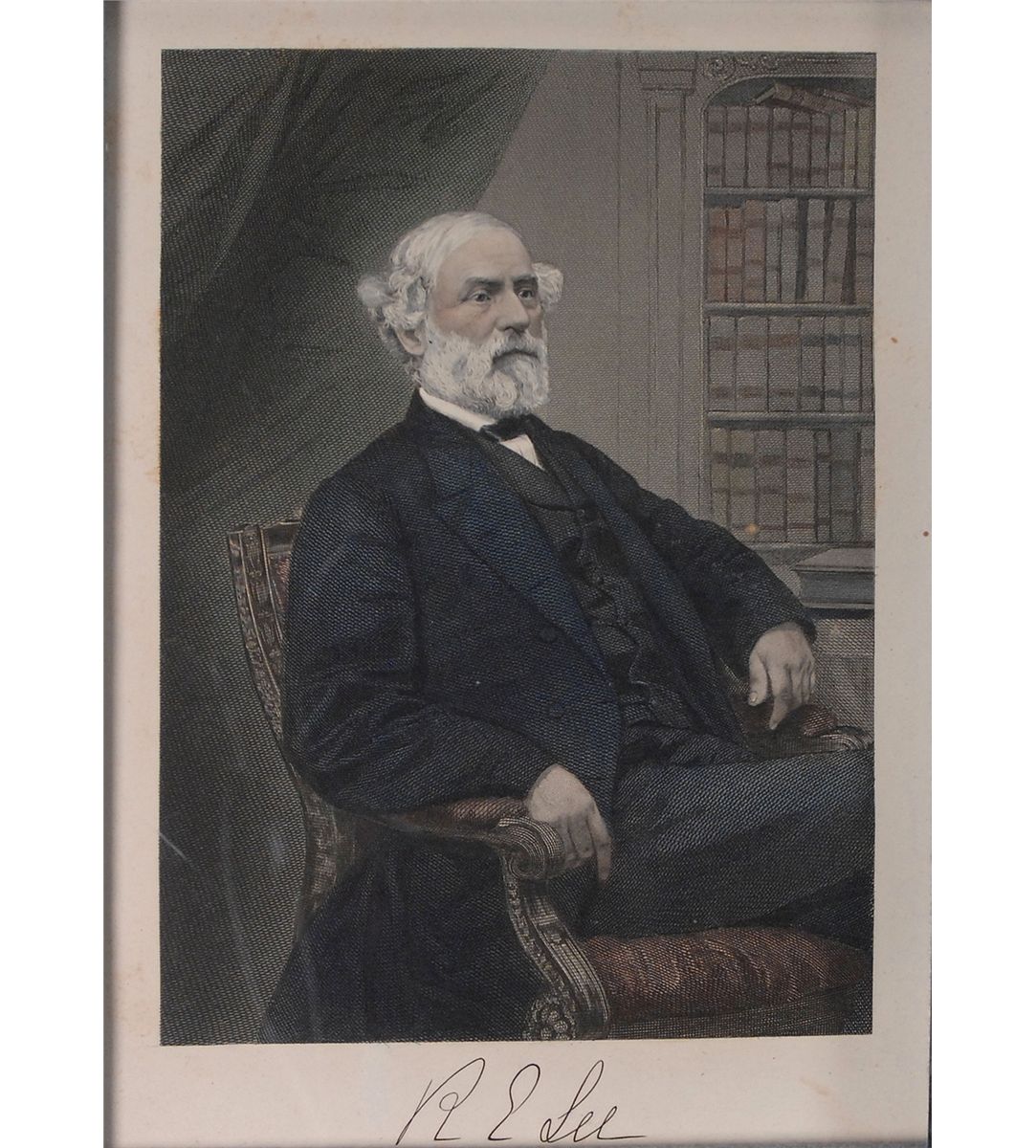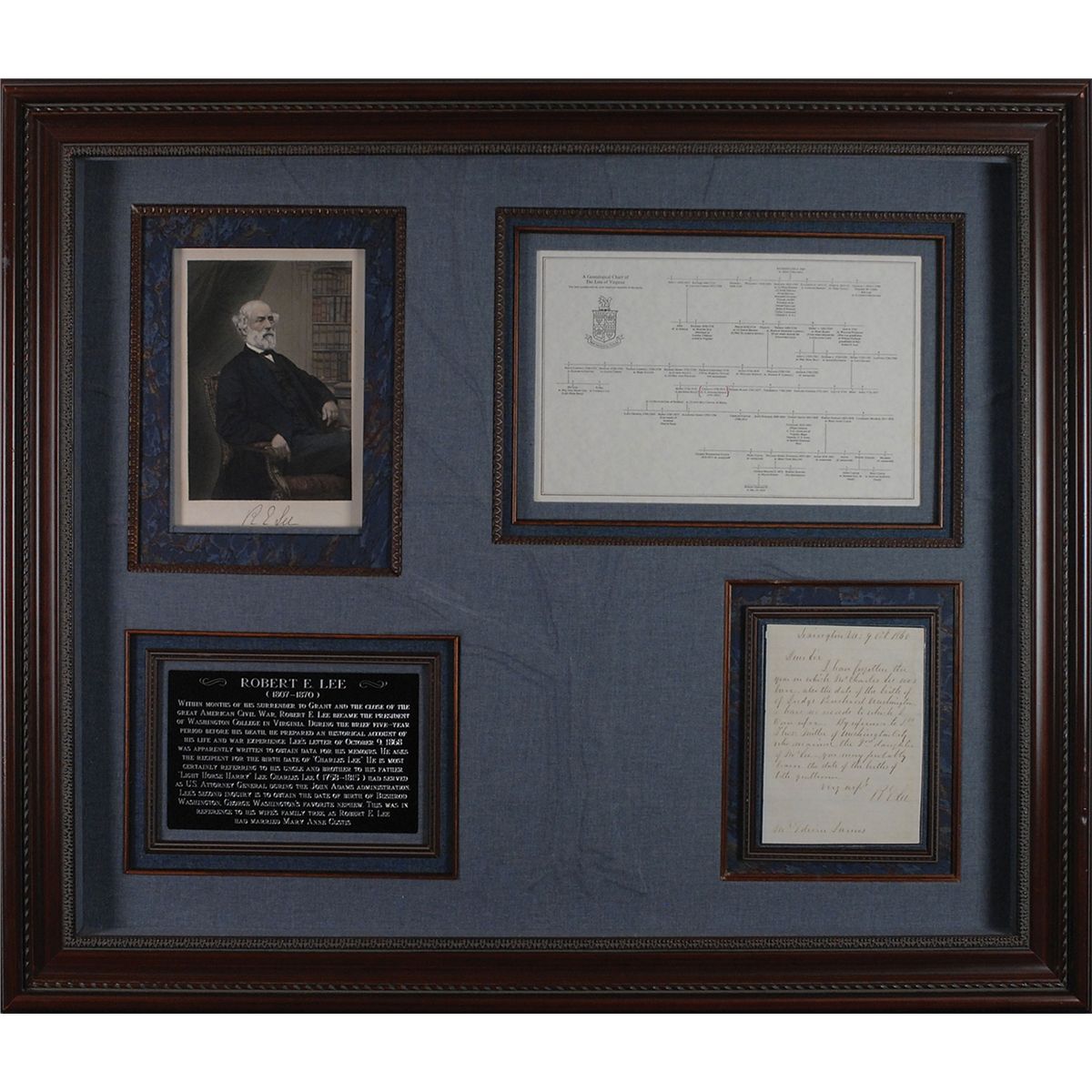 ALS signed “R. E. Lee,” one page, lightly-lined, 5 x 6.5, October 9, 1868. Letter to Mr. Edwin James. In full: “I have forgotten the year in which Mr. Charles Lee was born, also the date of the birth of Judge Bushrod Washington, I have no records to which I can refer. By reference to Dr. Thos: Miller of Washington City who married the 2nd daughter of Mr. Lee, you may probably learn the date of the births of both gentlemen.” Elaborately triple-matted and framed by the Kenneth R. Laurence Galleries with a color engraved portrait of Lee, a “Genealogy Chart of the Lees of Virginia,” and a descriptive plaque, with a subtle embossed ‘Tree of Life’ in the mat, to an overall size of 34.5 x 28.25. In fine condition, with a mild overall shade of toning to letter from previous display.