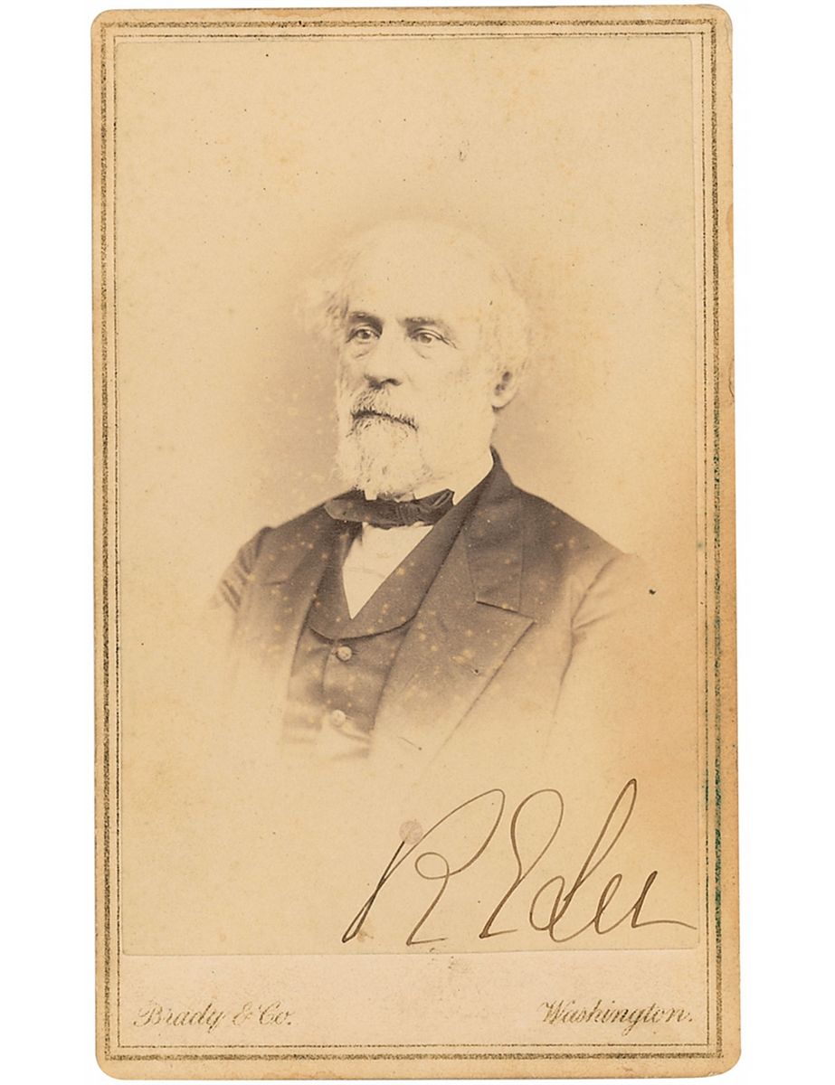Uncommon original 2.25 x 4 carte-de-visite bust portrait of Lee in a suit and bow tie, beautifully signed at the bottom of the image in black ink, “R. E. Lee.” Published by M. B. Brady & Co. National Photographic Portrait Galleries of Washington. In fine condition, with light toning to borders and speckling to image, a slight surface spot at the top of the ‘R’ in his signature, and unobtrusive mounting remnants to reverse. An extremely desirable postwar portrait, taken by one of the most famous photographers of the era.