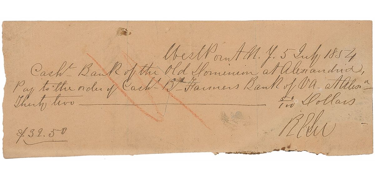 Scarce and extremely desirable handwritten check, 7.75 x 2.75, filled out and signed by Lee, “R. E. Lee,” payable to “Cash—B—Farmers Bank of Va” for $32.50, July 5, 1854. Lee adds further information at the top, “West Point, N. Y., Cash—Bank of the Old Dominion at Alexandria.” Several vertical folds, light creases and soiling, noticeable wrinkling to signature area adhesive remnants on reverse, and an expected cancellation cut and notation to body, otherwise very good condition. Accompanied by an engraved portrait of Lee. After distinguishing himself in the Mexican-American War, Lee reluctantly accepted an appointment as superintendent of the Military Academy at West Point in 1852, where he remained for three years. During this time he managed his affairs from afar, banking in his boyhood home of Alexandria with the Bank of the Old Dominion and Farmers Bank of Virginia, both of which would close during the Civil War. An extraordinarily desirable autograph prewar piece from the important Confederate leader.