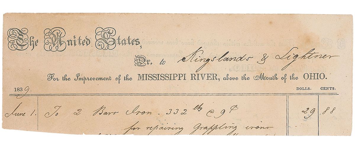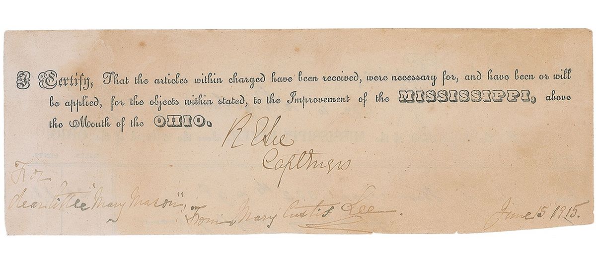 Partial self-contained partly-printed DS, signed “R. E. Lee, Capt. Engrs.,” one page, 8 x 2.75, no date but circa June 1839. Lee certifies the necessity and receipt of supplies for the “Improvement of the Mississippi, above the Mouth of the Ohio.” The reverse is filled out in another hand with the purchase order, submitted to the firm Kingslands & Lightner and dated June 1, 1839, for “2 Bars Iron—332 lbs @ 9¢, for repairing grappling irons,” totaling $29.88. This was clipped from the top of a larger document by Lee’s eldest daughter, Mary Custis Lee, to give as a gift to family friend Mary Mason Anderson, signed and inscribed at the bottom, “For dear little ‘Mary Mason,’ from Mary Custis Lee, June 15, 1915.” In fine condition, with light toning and expected document wear. Mary Mason Anderson was the granddaughter of Joseph Reid Anderson, an iron manufacturer and Confederate army officer, whose Tredegar Iron Company was the largest producer of munitions, cannon, railroad iron, steam engines, and other ordnance for the Confederacy—perhaps it was this ironworks association that inspired Mary Custis Lee to present this specific autograph of her father. At the time he signed this, Lee was a decade removed from graduating West Point as a lieutenant in the Corps of Engineers. Between 1837 and 1842, he supervised the development of St. Louis harbor and the upper Mississippi and Missouri rivers, ultimately earning a promotion to captain for his work there. A highly desirable document in both its early date and direct family provenance.