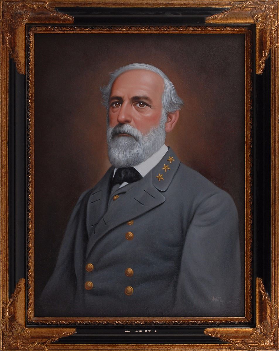 Impressive original painting of Robert E. Lee, oil on canvas, 17.5 x 23.5, showing the Confederate commander in a distinguished half-length pose, signed in the lower right by the artist, “Noel.” Elaborately framed to an overall size of 23.25 x 29. In fine condition, with the name plaque detached from frame.