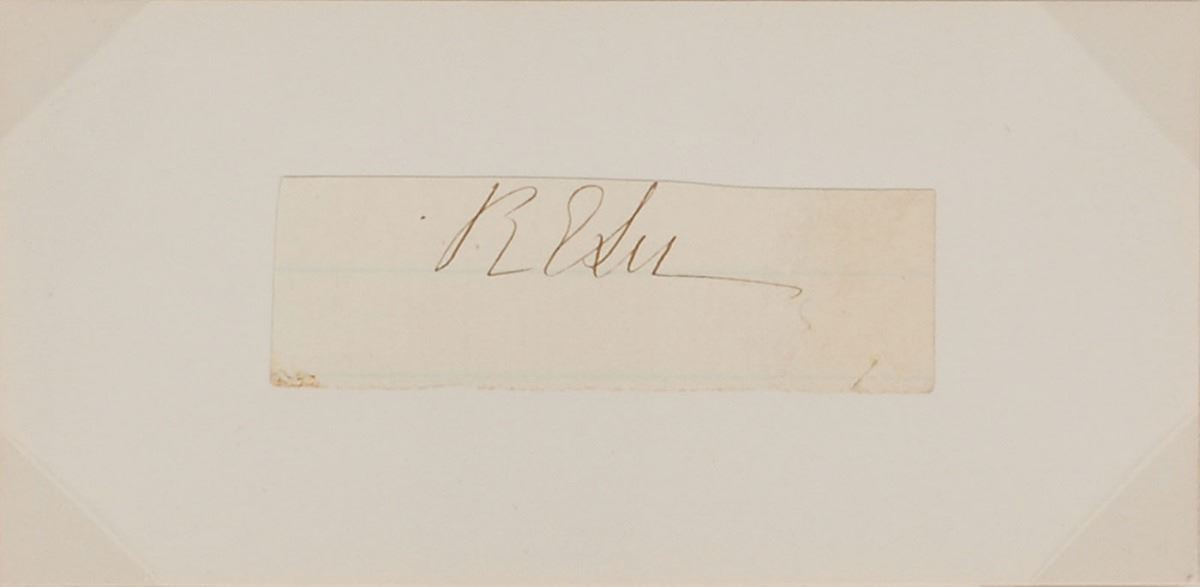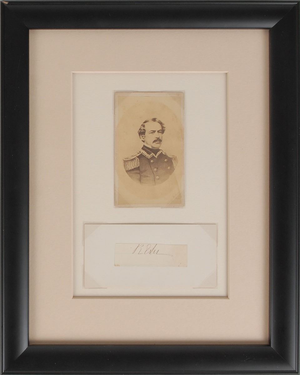 Neat ink signature, “R. E. Lee,” on an off-white 2.5 x .75 lightly-lined slip affixed to a slightly larger card. Mounted, matted, and framed with a carte-de-visite of Lee to an overall size of 10.25 x 13. In fine condition.
