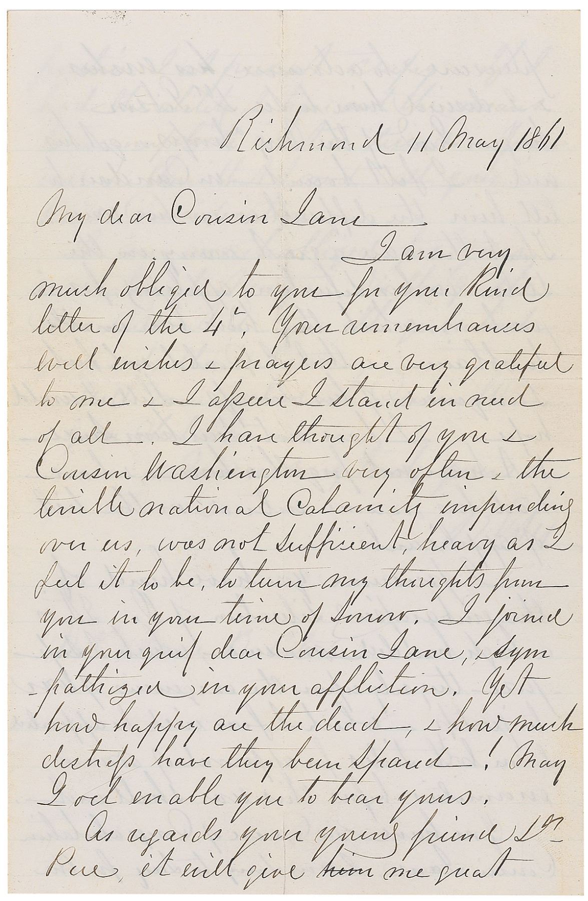 Incredible war-dated ALS signed “R. E. Lee,” three lightly-lined pages on two adjoining sheets, 5.25 x 8, May 11, 1861. Letter to his cousin Jane B. Peter. In full: “I am very much obliged to you for your kind letter of the 4th. Your remembrances well wishes & prayers are very grateful to me & I assure I stand in need of all. I have thought of you & Cousin Washington very often & the terrible national calamity impending over us, was not sufficient, heavy as I feel it to be, to turn my thoughts from you in your time of sorrow. I joined in your grief dear Cousin Jane, sympathized in your affliction. Yet how happy are the dead, & how much distress have they been spared! May God enable you to bear yours.