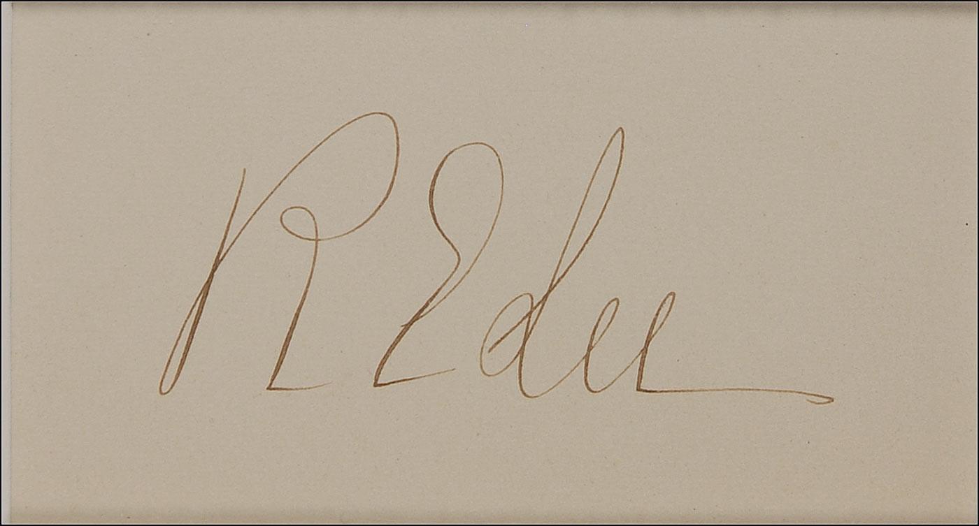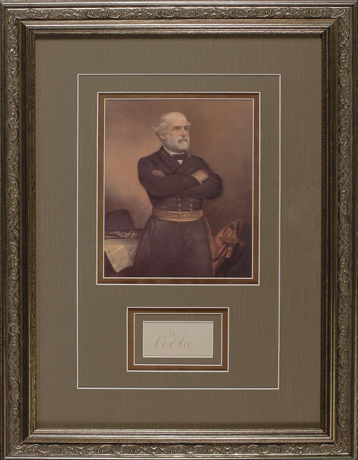Career army officer and the most successful general of the Confederate forces during the Civil War. He eventually commanded all Confederate armies as general-in-chief. His victories against superior forces in an ultimately losing cause won him enduring fame. After the war, he urged sectional reconciliation, and spent his final years as president of the school that would come to bear his name, Washington and Lee University. Choice ink signature, “R. E. Lee,” on an off-white 2.75 x 1.5 slip. Triple cloth-matted and framed with a color portrait to an overall size of 14.5 x 20. In fine condition. A wonderful example.