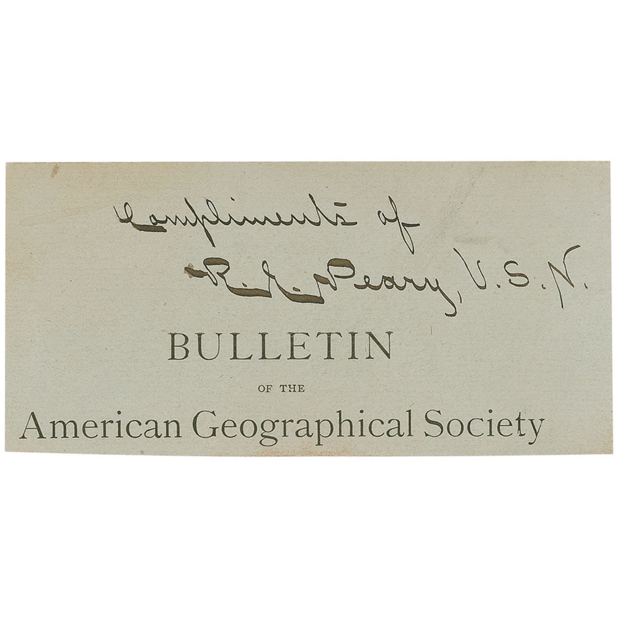 Fountain pen signature, “Compliments of R. E. Peary, U.S.N.,” on a light green 4.75 x 2.25 slip clipped from a Bulletin of the American Geographical Society. Scattered light soiling and toning, otherwise fine condition.