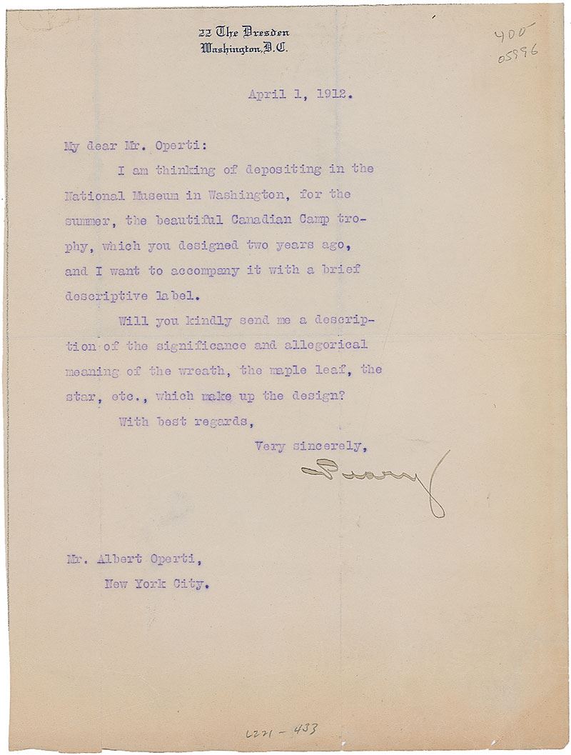 TLS signed “Peary,” one page, 7.25 x 10, personal letterhead, April 1, 1912. Letter to Albert Operti. In full: “I am thinking of depositing in the National Museum in Washington, for the summer, the beautiful Canadian Camp trophy, which you designed two years ago, and I want to accompany it with a brief descriptive label. Will you kindly send me a description of the significance and allegorical meaning of the wreath, the maple leaf, the star, etc., which make up the design?” In very good condition, with slightly trimmed edges, intersecting folds, one through a single letter of signature, a couple pencil notations, small edge tears to bottom, and some mild toning and creasing.