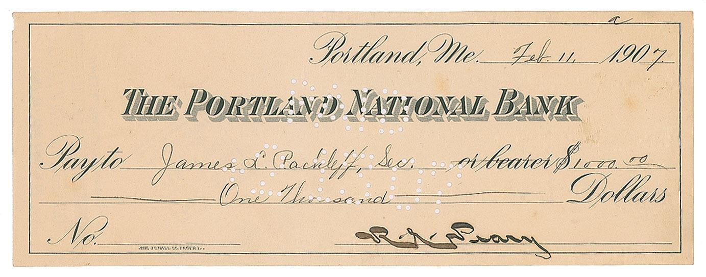 American explorer (1856–1920) best known for his claim as the first man to reach the North Pole; whether his expedition actually reached the target destination remains a long-argued point of history. Portland National Bank check, 8.25 x 3, filled out in another hand and boldly signed by Peary, "R. E. Peary," payable to James R. Rackleff for $1,000, February 11, 1907. In fine condition.