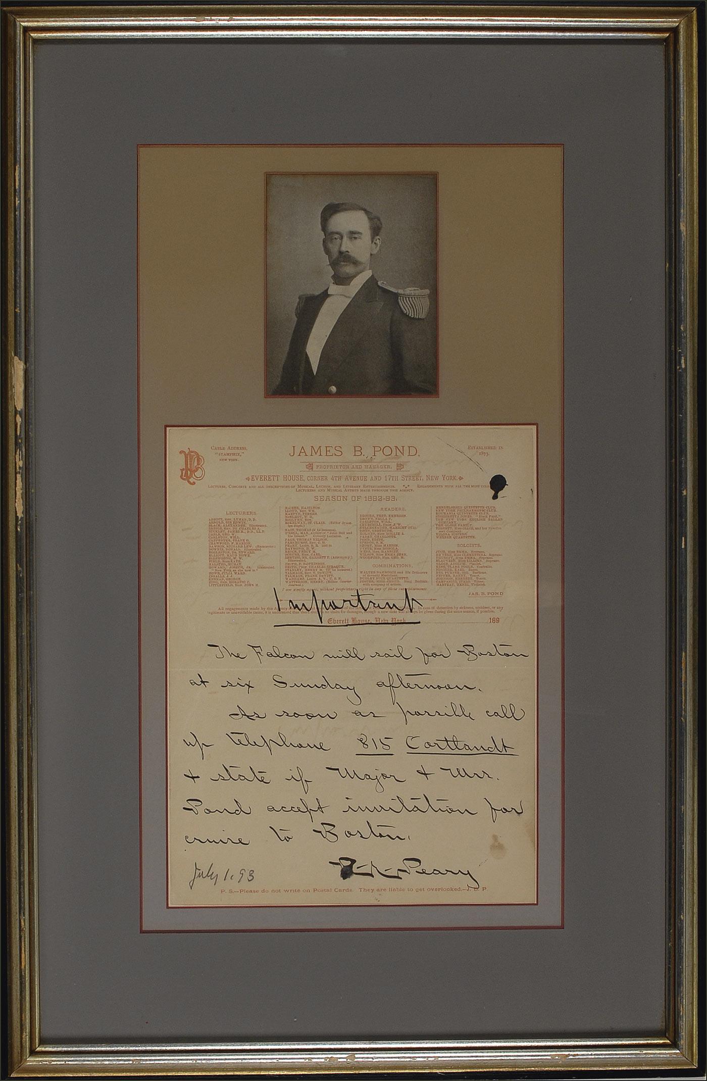ALS signed “R. E. Peary,” one page, 8.5 x 11, James P. Pond letterhead, dated July 1, 1893, in pencil by another person. Marked “Important,” Peary inquires about the recipient’s travel plans. In part: “The Falcon will sail for Boston at six Sunday afternoon…state if Major & Mrs. Pond accept invitation for cruise to Boston.” Scattered creasing, mild soiling and toning, light mirroring of text from premature folding, and a large ink blotch to the first letter of his name, otherwise fine condition.