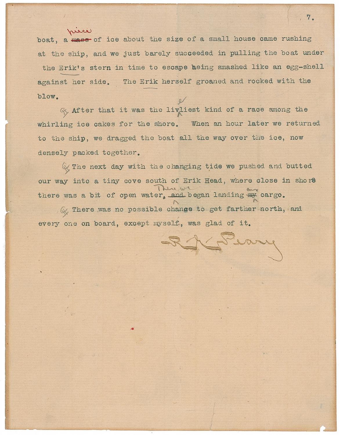 American explorer (1856–1920) best known for his claim as the first man to reach the North Pole; whether his expedition actually reached the target destination remains a long-argued point of history. Signed and hand-corrected typed partial manuscript, one page, 8 x 10, designated at the top as page 7, and signed at the conclusion in fountain pen, “R. E. Peary.” Text reads, in full: “boat, a piece of ice about the size of a small house came rushing at the ship, and we just barely succeeded in pulling the boat under the Erik’s stern in time to escape being smashed like an egg-shell against her side. The Erik herself groaned and rocked with the blow. After that it was the liveliest kind of a race among the whirling ice cakes for the shore. When an hour later we returned to the ship, we dragged the boat all the way over the ice, now densely packed together. The next day with the changing tide we pushed and butted our way into a tiny cove south of Erik Head, where close in shore there was a bit of open water. There we began landing our cargo. There was no possible chance to get farther north, and every one on board, except myself, was glad of it.” Peary has made several ink and pencil corrections to the page, adding several words, underlining a couple and noting paragraphs. In very good condition, with intersecting folds, one through a single letter of signature, uniform light toning, and scattered edge wear and small tears. This manuscript page recounts the climatic end of Peary’s 1901 arctic expedition when, as noted, “a piece of ice about the size of a small house came rushing at the ship” and a growing abundance of icebergs forced the explorer—and grateful crew—to abandon the voyage “to get farther north.” He would—at least according to the explorer—finally reach the geographic North Pole in 1909. The article appeared in a 1905 issue of Pall Magazine. An incredibly scarce piece of written history, told by the man who was there.