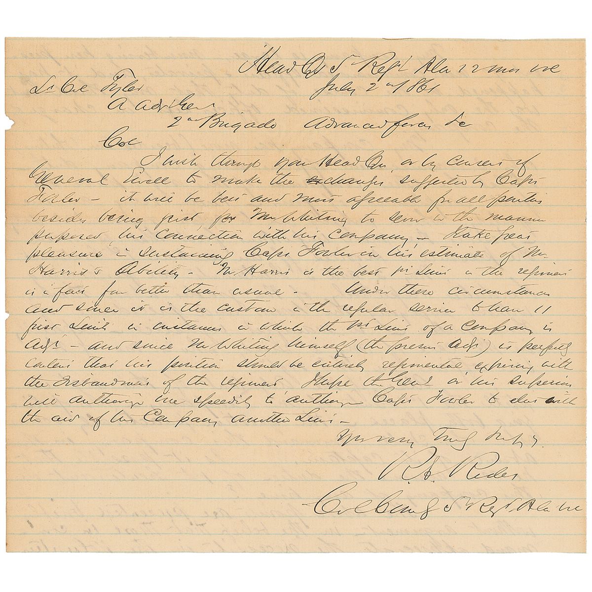 Confederate general (1829–1864) who was killed at the Third Battle of Winchester in the Shenandoah Valley. Rare war-dated ALS signed “R. E. Rhodes, Col. Comg. 5th Reg. Ala. Vols,” one page, lightly-lined, 8 x 7, July 2, 1861. Letter to Lt. Col. Charles H. Tyler, seeking Ewell’s authorization of an additional first lieutenant in his regiment. In part: “It will be best and most agreeable for all parties…for Mr. Whiting to serve in the manner proposed, his connection with his company. I take great pleasure in sustaining Capt. Fowler in his estimate of Mr. Harris’s ability. Mr. Harris is the best 1st Lieut. in the regiment, in fact far better than usual. Under these circumstances and since it is the custom in the regular service to have 11 first Lieuts. in instances in which the 1st Lieut. of a Company is Adj—and since Mr. Whiting himself (the present Adj) is perfectly content that his position should be entirely regimental, expiring with the disbandment of the regiment. I hope the Gen’l or his superiors will authorize me speedily to authorize Capt. Fowler to elect with the aid of his Company another Lieut.” A partial letter concerning the matter is on the reverse, written in an unknown hand. Mild toning over upper portion of text and a couple of chips to left edge, otherwise fine condition. Rodes is quite scarce in any autographic material, particularly in war-dated items. This is the first we have ever offered.