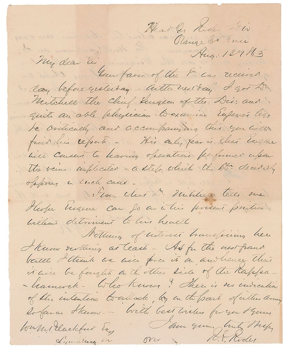 War-dated ALS signed “R. E. Rodes,” one page both sides, 7 x 8.75, August 13, 1863. Letter to William M. Blackford, in part: “Your favor of the 8th was received day before yesterday…next day I got Dr. Mitchell the Chief Surgeon of the Div: and quite an able physician to examine Eugene’s legs...His only fear is that Eugene will consent to having operations performed upon the veins implicated, a step which the Dr. decidedly offers in such cases. From what Dr. Mitchell tells me I hope Eugene can go as in his present position without detriment to his health. Nothing of interest transpiring here. I know nothing at least. As for the next grand battle, I think we will force it on and hence that it will be fought at the other side of the Rappahannock. Who knows? There is no indication of the intention to attack another part of either army so far as I know.”