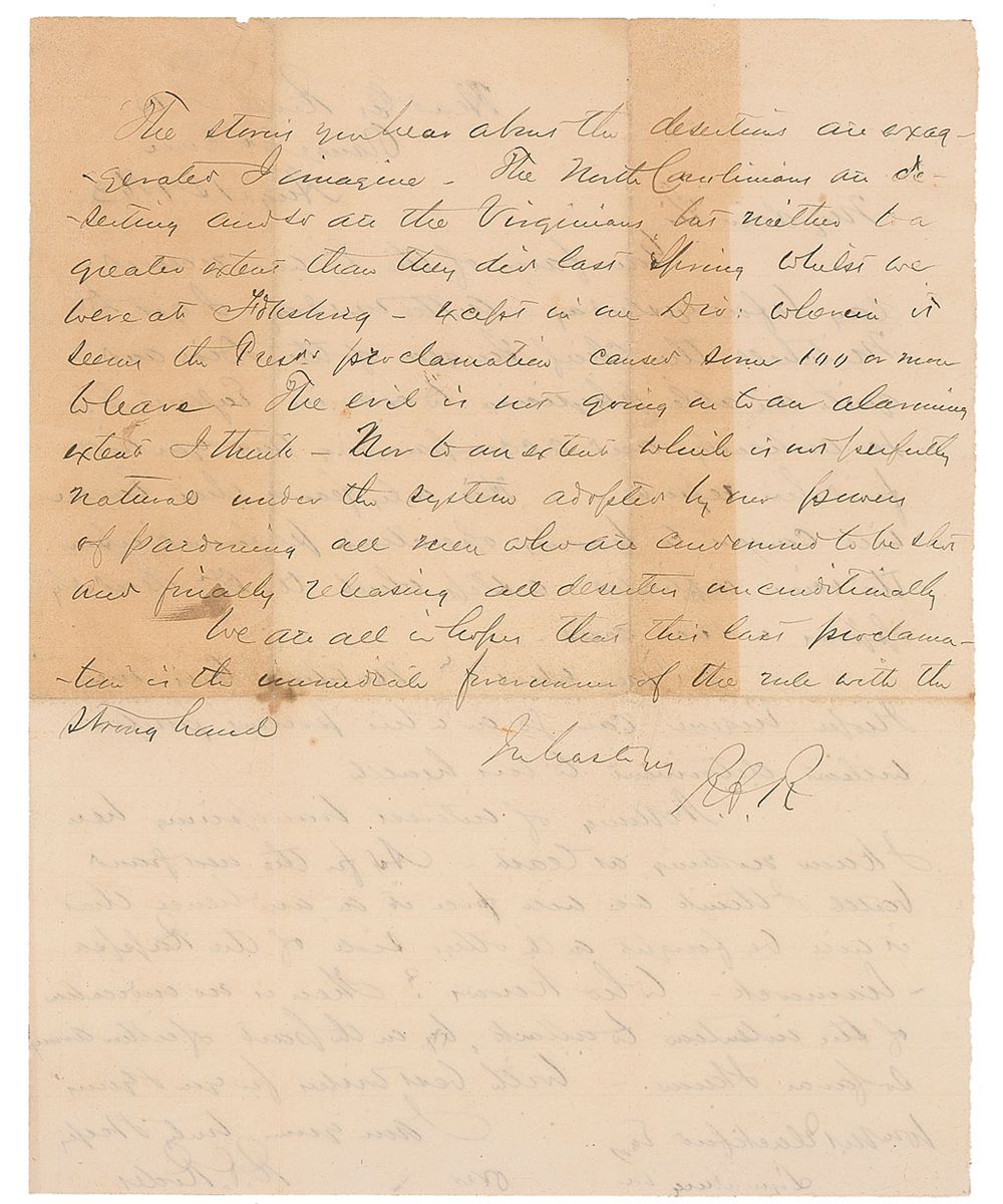 In lengthy postscript on the reverse, initialed “R.E.R.,” Rodes continues: “The stories you hear about the desertions are exaggerated I imagine. The North Carolinians are deserting and so are the Virginians but neither to a greater extent than they did last spring whilst we were at Fdksburg [sic], except in one Div. wherein it seems the Presn’s proclamation causes some 100 or more to leave. The evil is not going on to an alarming extent I think. Nor to an extent which is not perfectly natural under the system adopted by her powers of pardoning all men who are condemned to be shot and finally releasing all deserters unconditionally. We are all in hopes that this last proclamation is the immediate forerunner of the rule with the strong hand.”