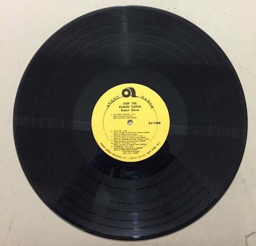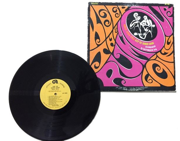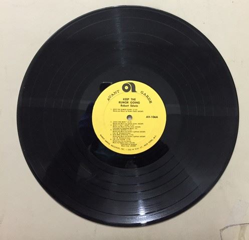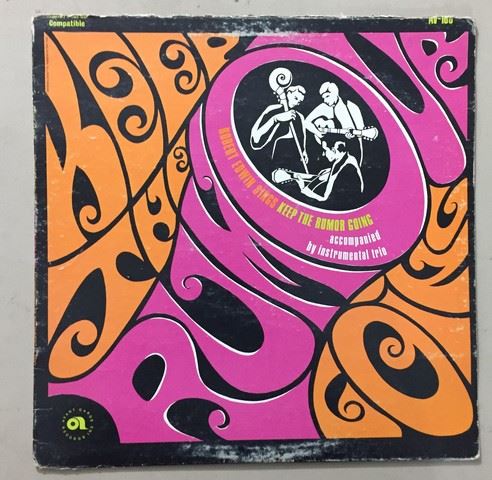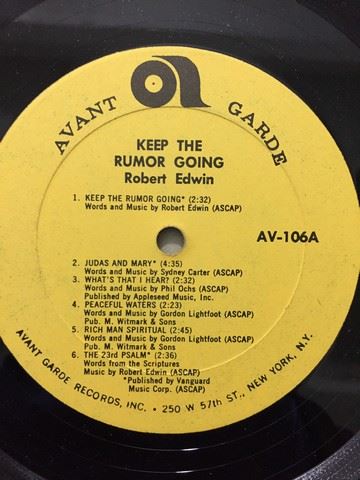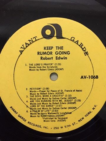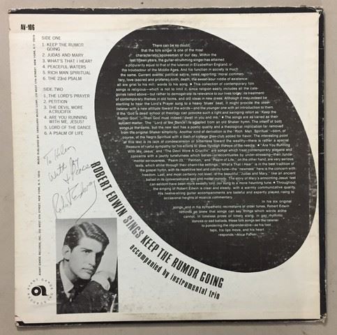 Robert Edwin "Keep the Rumor Going" accompanied by instrumental trio (1966) vinyl record, 12 songs between both sides, songs include "Keep the rumor going"; "Petition"; "A psalm of life"; etc., autograph by Robert Edwin with personal message stating "To Helen, with joy and peace", album cover shows the name of the album in big orange and neon pink psychedelic font as well as 3 man trio inside of the letter "O" of the word "Rumor"