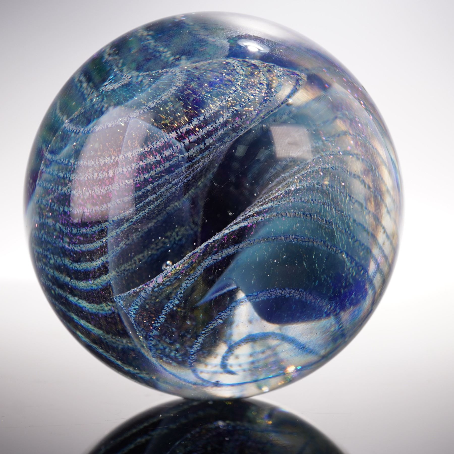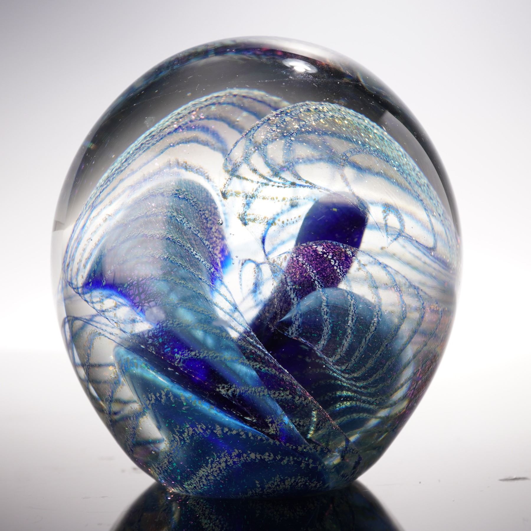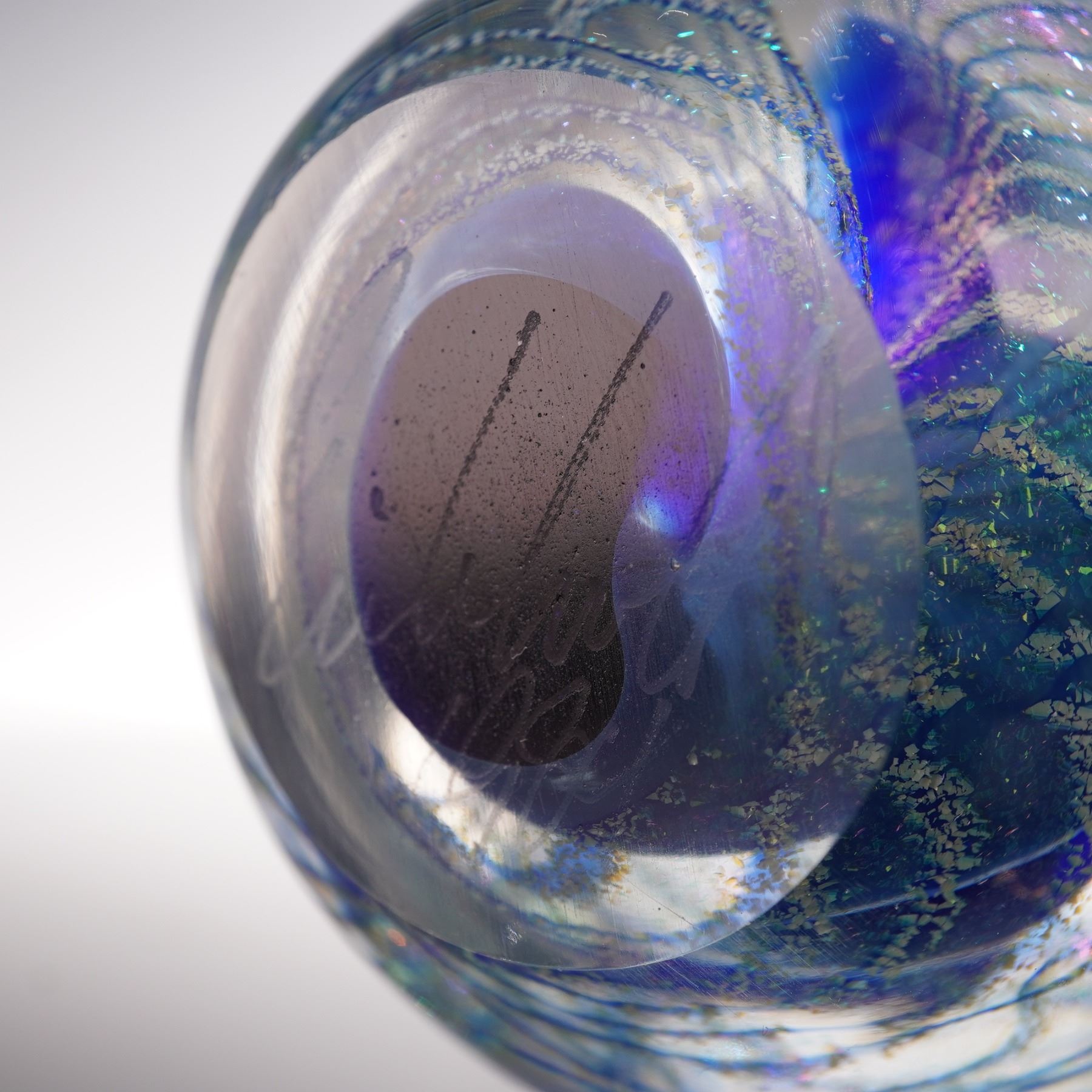 A striking art glass paperweight, featuring a swirling design in shades of blue, purple, and controlled iridescent pattern. Signed by the artist.