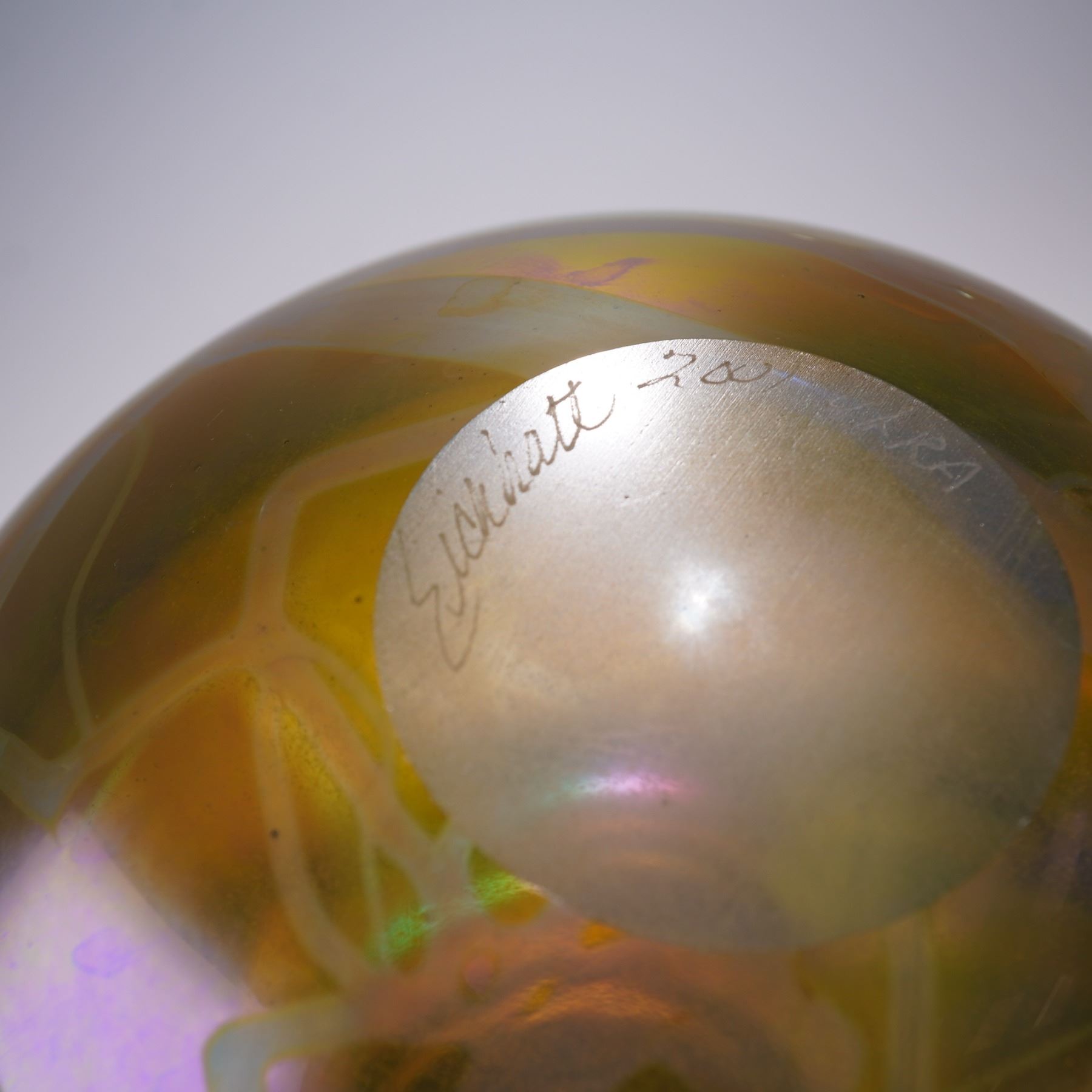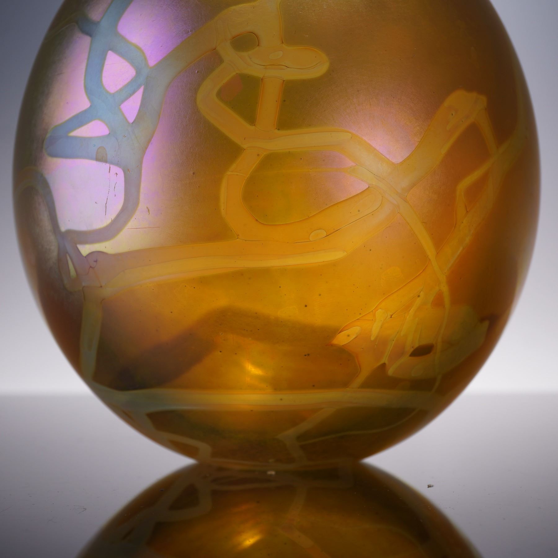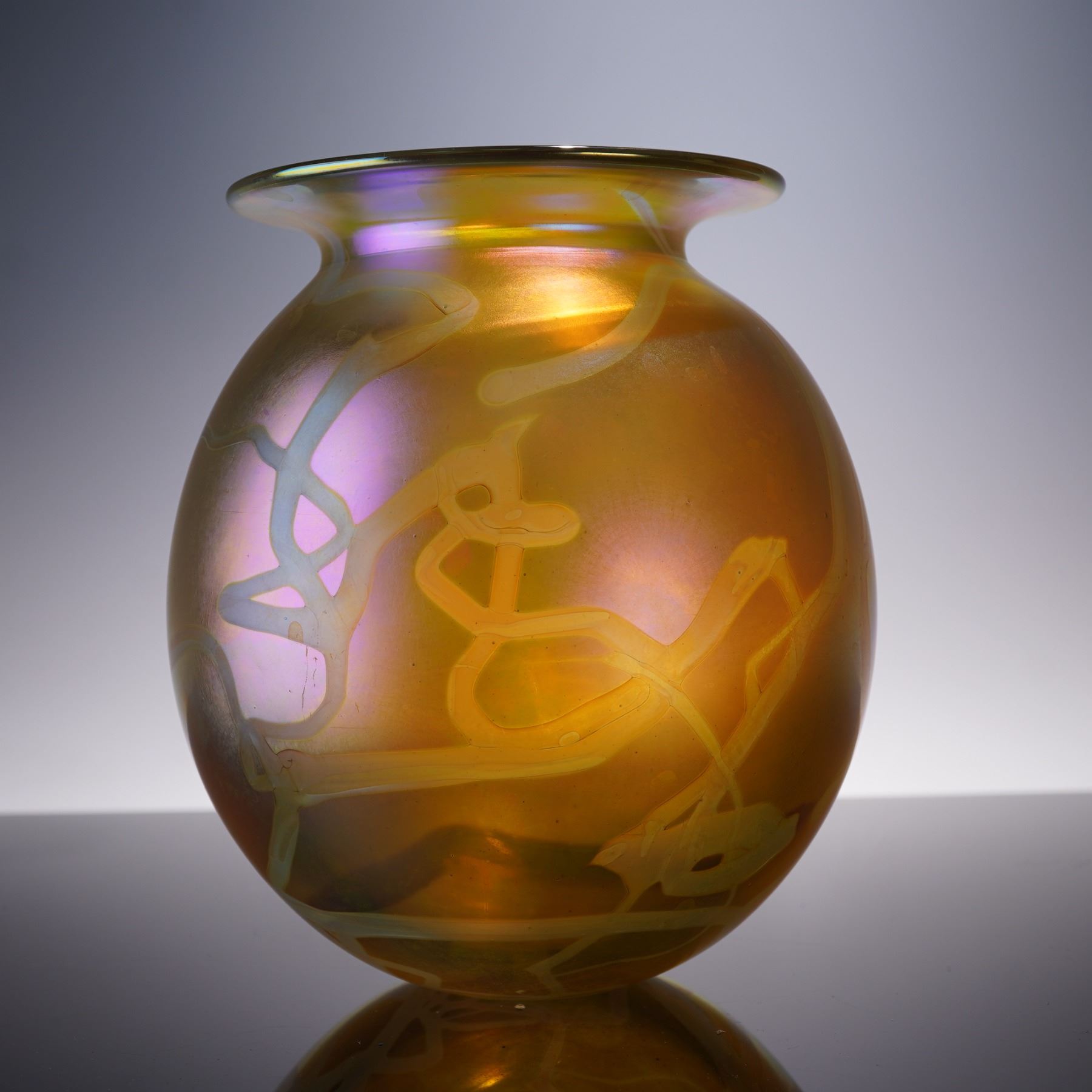 Handblown art glass vase by American glass artist Robert Eickholt, dated 2001 and signed to the base. This rounded form features a lustrous golden-orange iridescent surface with ribbon-like trails in contrasting pale hues, creating movement and depth. The inscription also includes the word VARA, which may indicate a specific pattern or series. Eickholt is known for his innovative use of color and iridescence, making this an excellent example of his studio work.