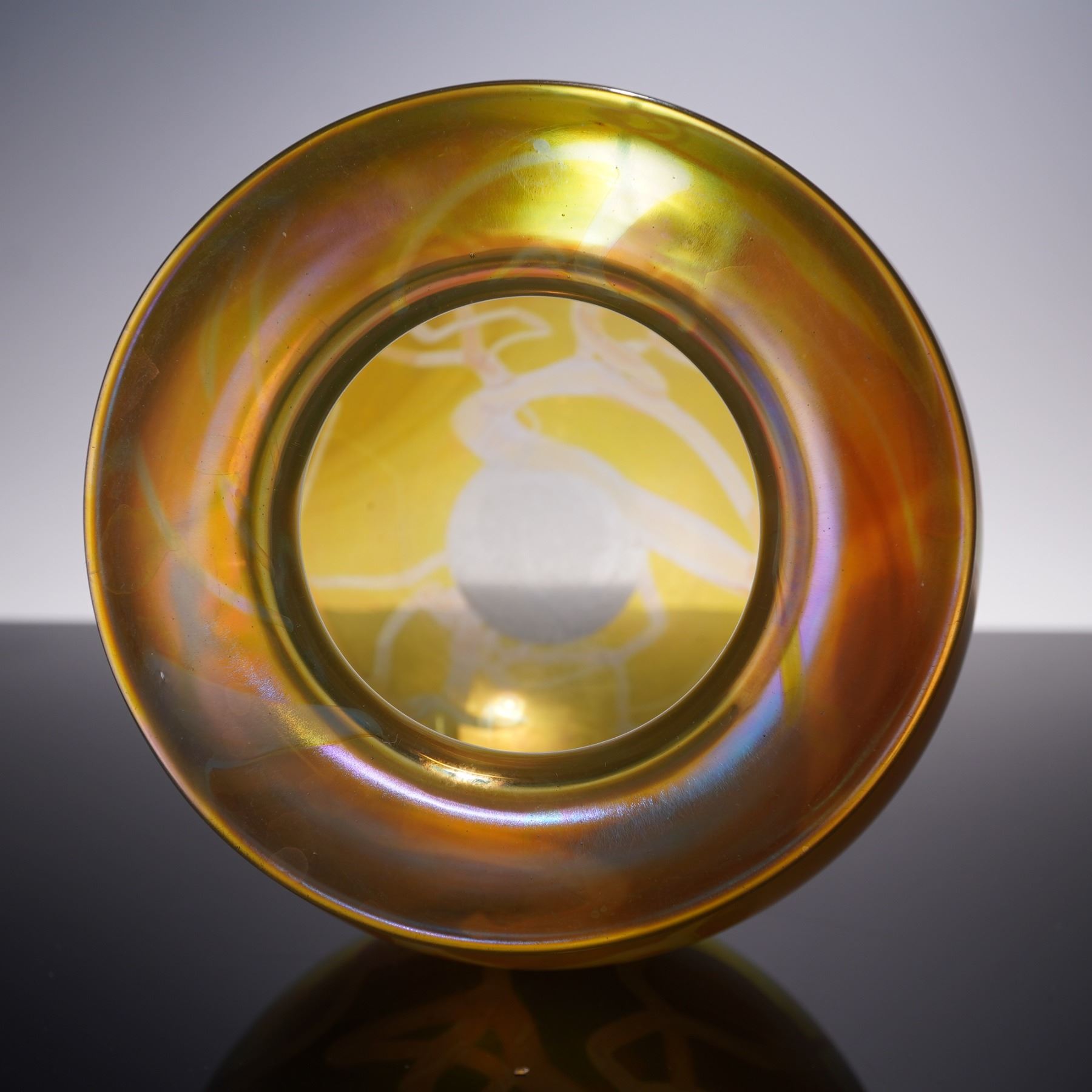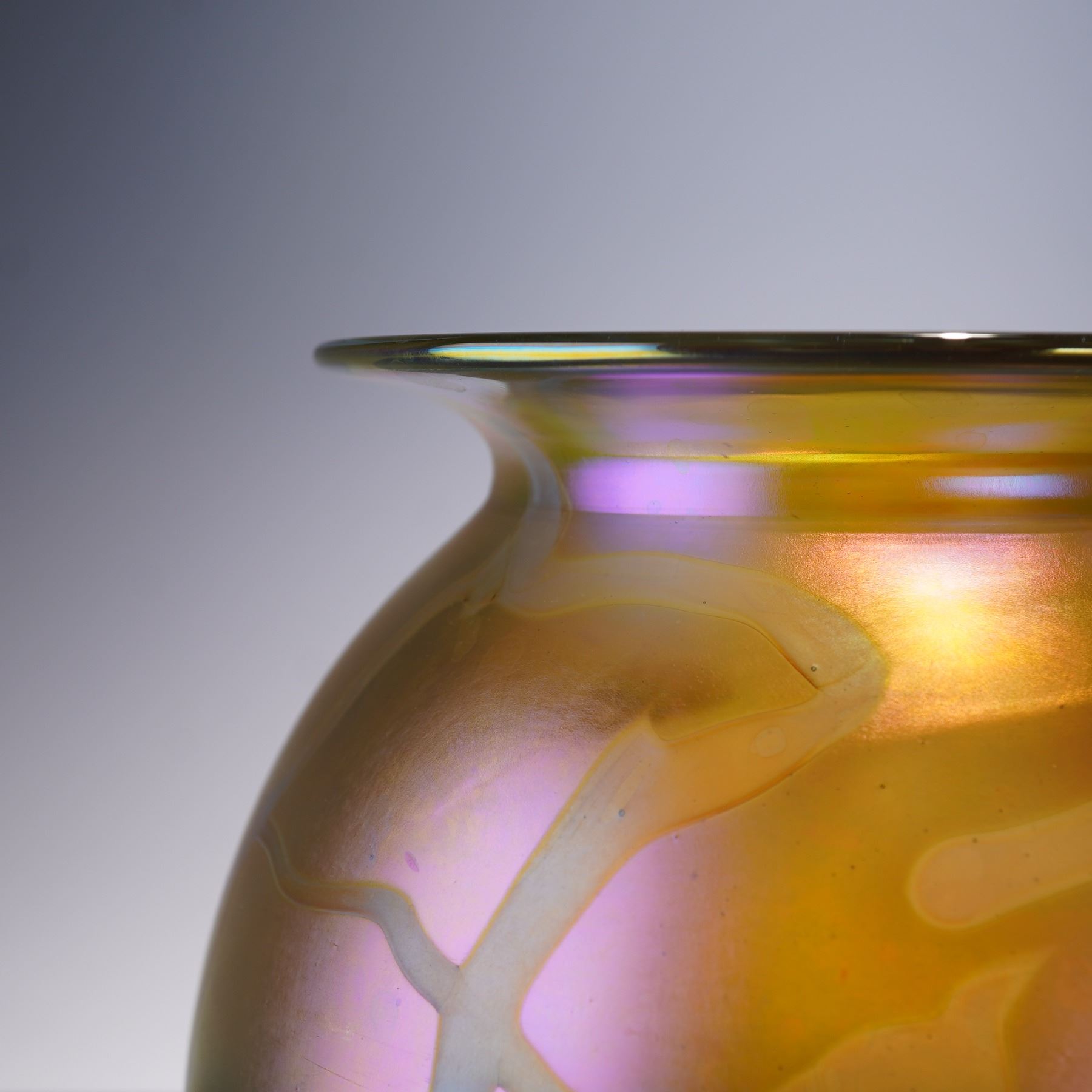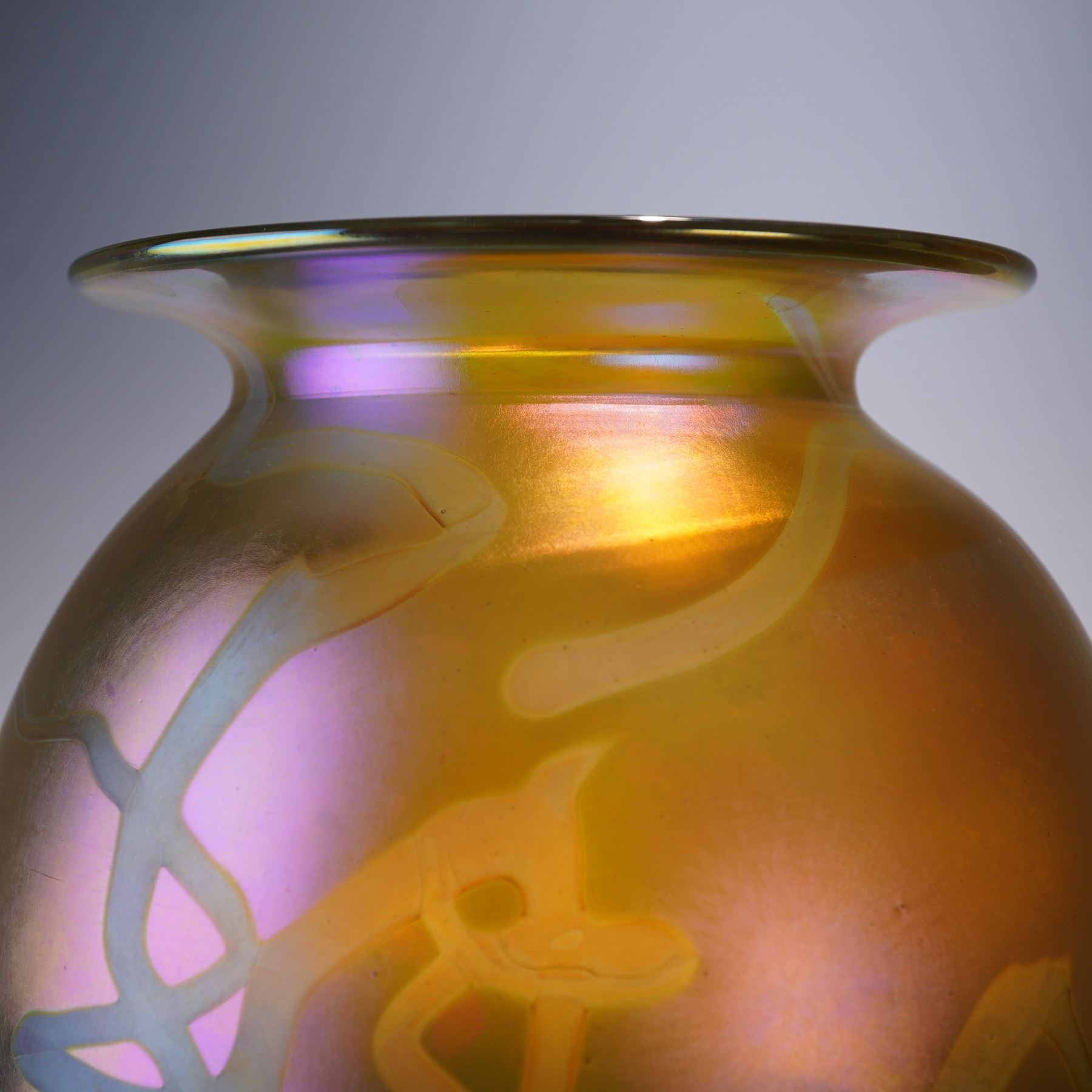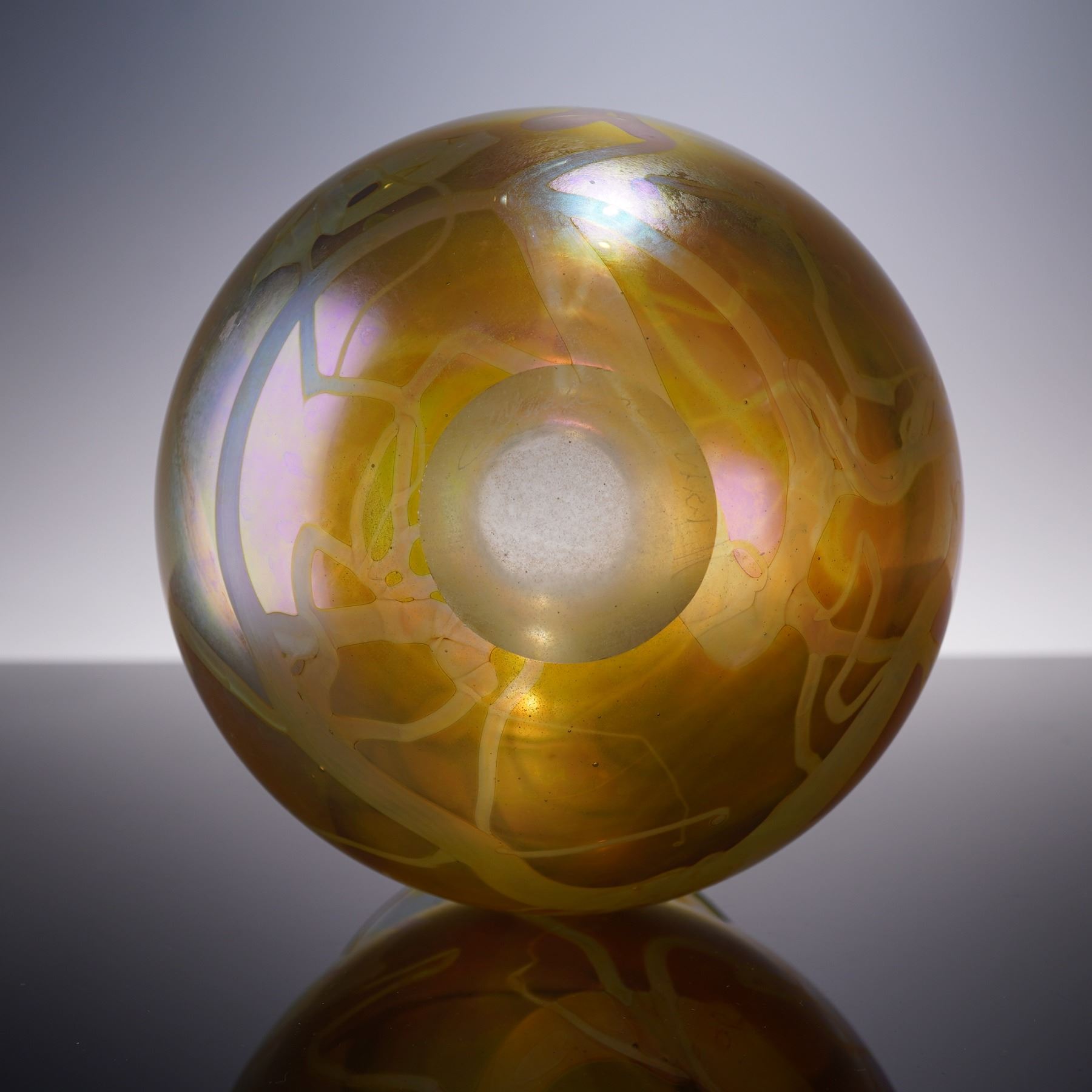 Handblown art glass vase by American glass artist Robert Eickholt, dated 2001 and signed to the base. This rounded form features a lustrous golden-orange iridescent surface with ribbon-like trails in contrasting pale hues, creating movement and depth. The inscription also includes the word VARA, which may indicate a specific pattern or series. Eickholt is known for his innovative use of color and iridescence, making this an excellent example of his studio work.