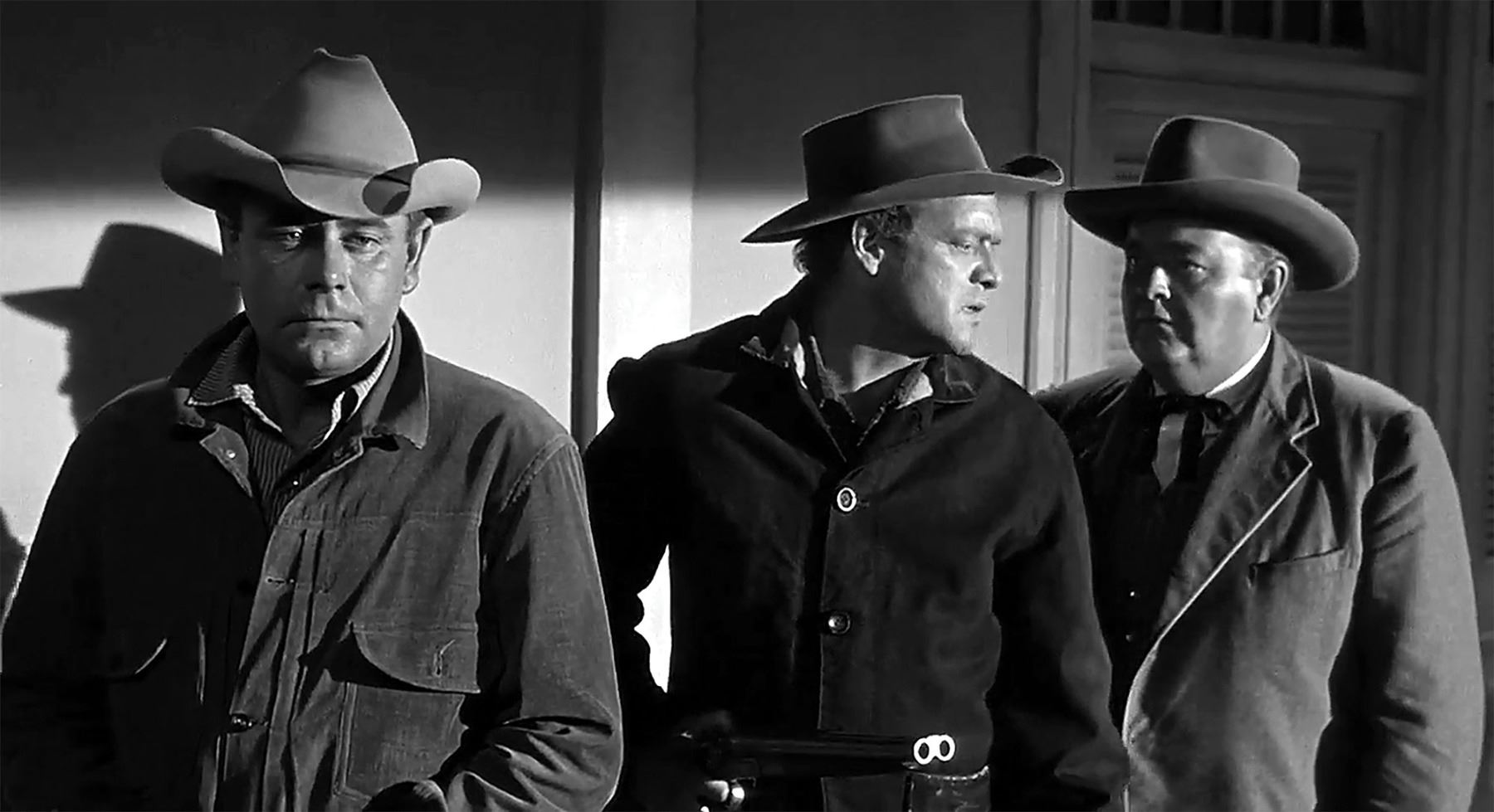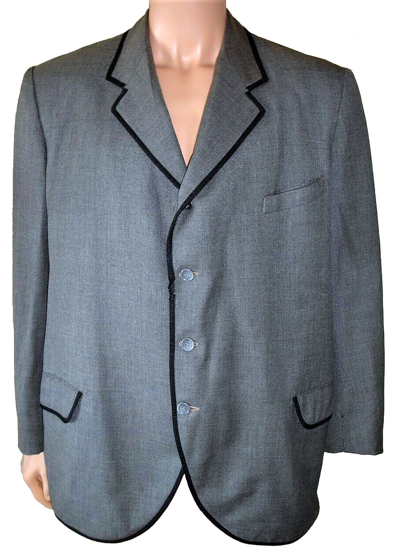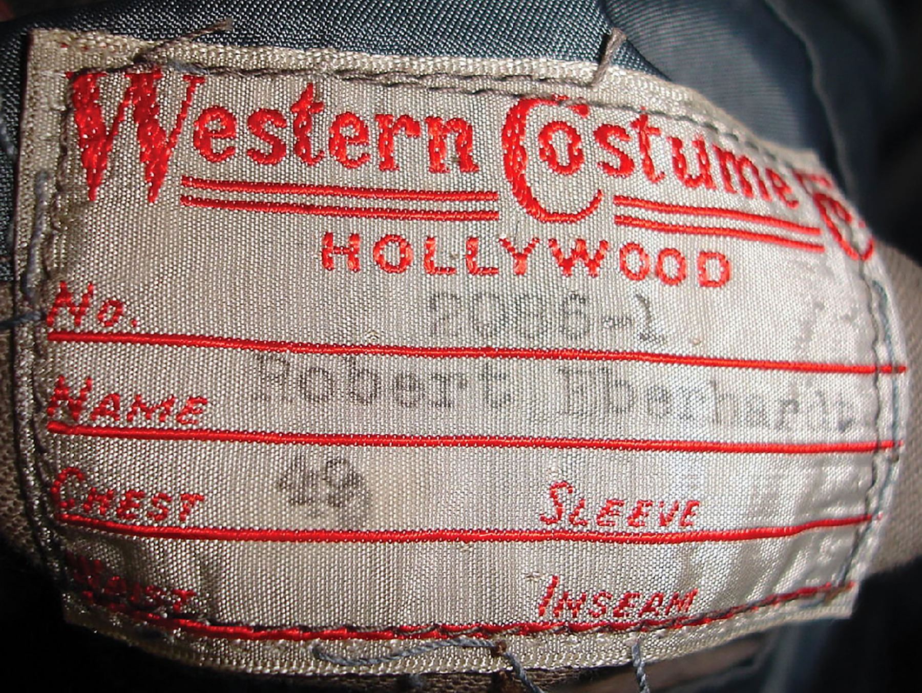 A large (size 49) coat worn in 3:10 to Yuma, a western classic, by Emhardt as Mr. Butterfield, owner of the stage coach line, directed by Delmer Daves and starring Glenn Ford and Van Johnson. Amazingly, in Daves' next film, The Badlanders (1958), with Alan Ladd and Ernest Borgnine, Emhardt was also cast wearing the same coat. Inside is the Western Costume Co. label with his name and number. Emhardt became one of the most familiar character actors on 1960s television appearing in Bonanza (3 times), The Man from U.N.C.L.E. (twice), Gunsmoke (twice), and Perry Mason (3 times) as well as nearly every other remembered series—most often cast as a villain. The piping is now black from yet another later use.