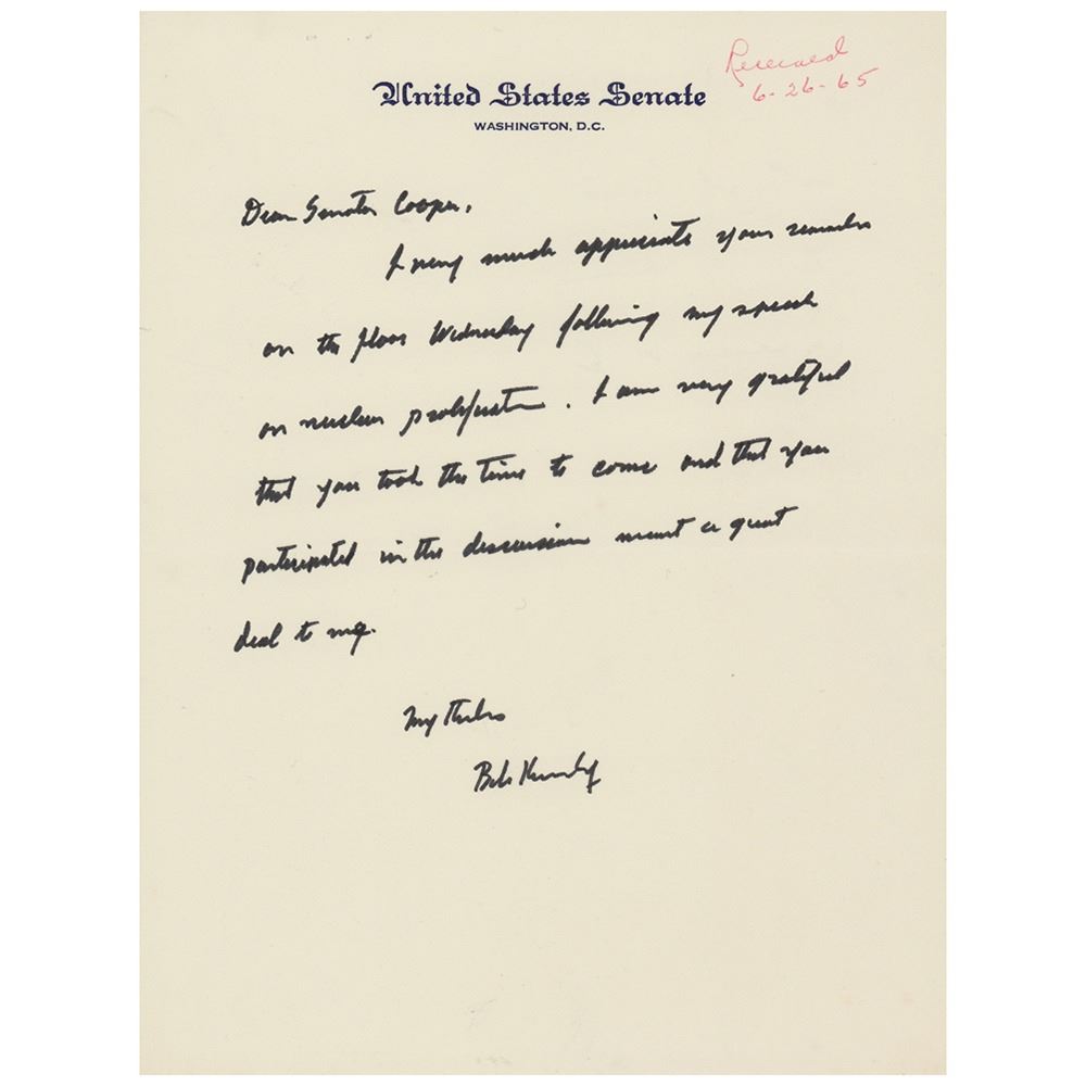 ALS signed “Bob Kennedy,†one page, 6 x 8, United States Senate letterhead, no date but annotated as received on June 26, 1965. Handwritten letter to Senator John S. Cooper of Kentucky, in full: "I very much appreciate your remarks on the floor Wednesday following my speech on nuclear proliferation. I am very grateful that you took the time to come and that you participated in the discussion meant a great deal to me." In fine condition.