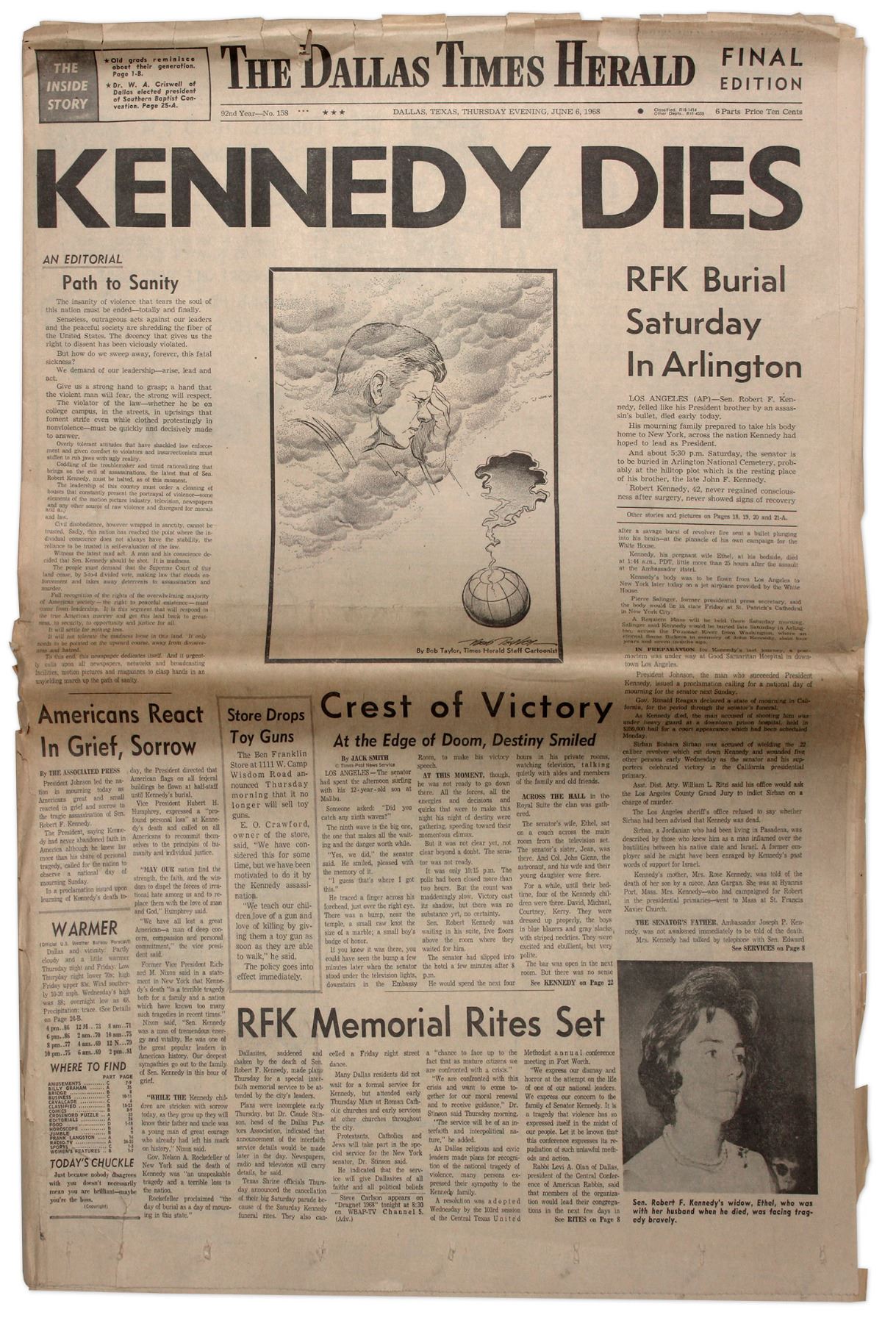 Senator Robert F. Kennedy's death by assassination takes the front page of the 6 June 1968 edition of ''The Dallas Times Herald''. The events leading up to his shooting the day before at the Ambassador Hotel in Los Angeles are chronicled in detail here along with editorials and information on the burial plans. One of 6 sections. Very light toning and some tears to brittle edges, overall very good.