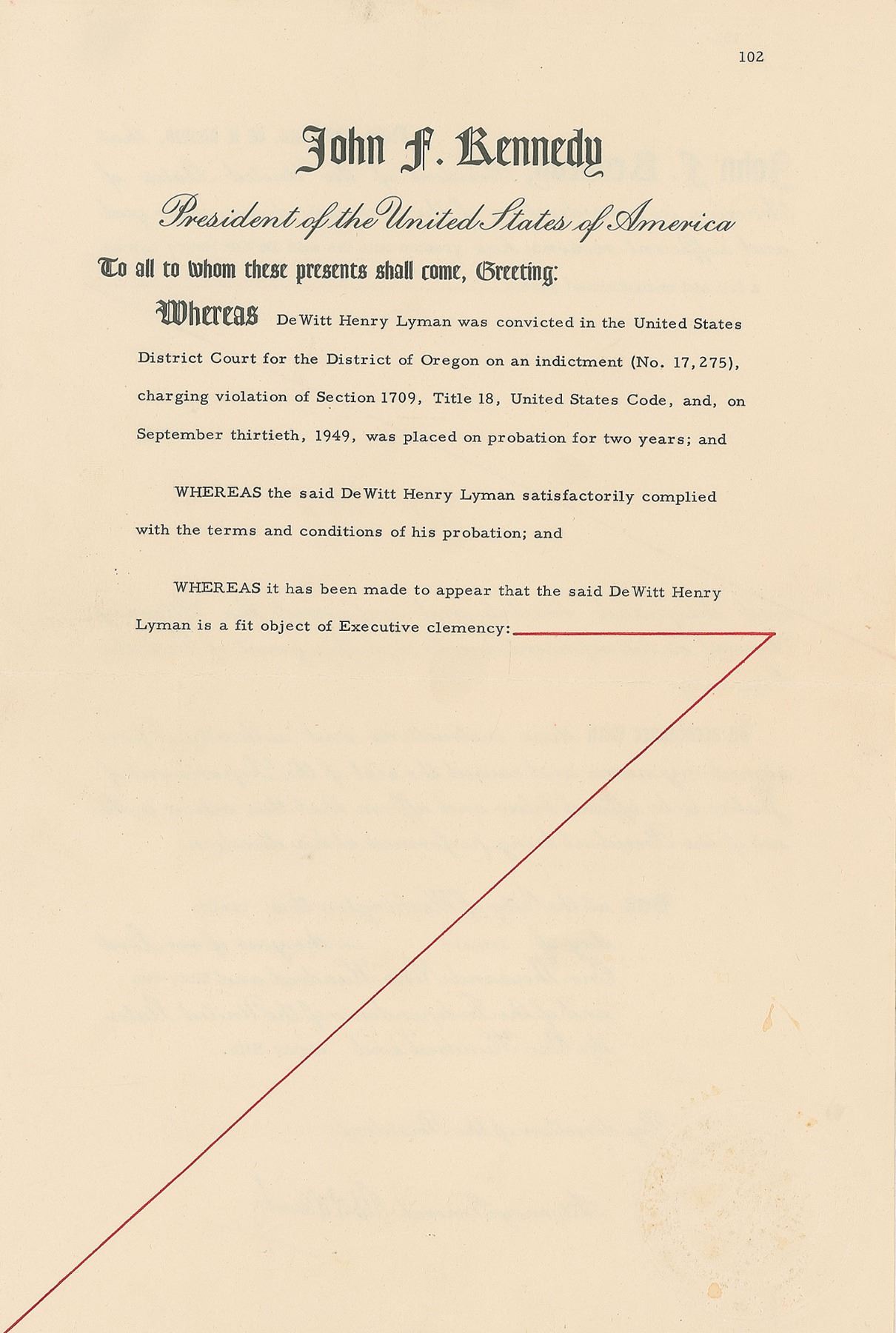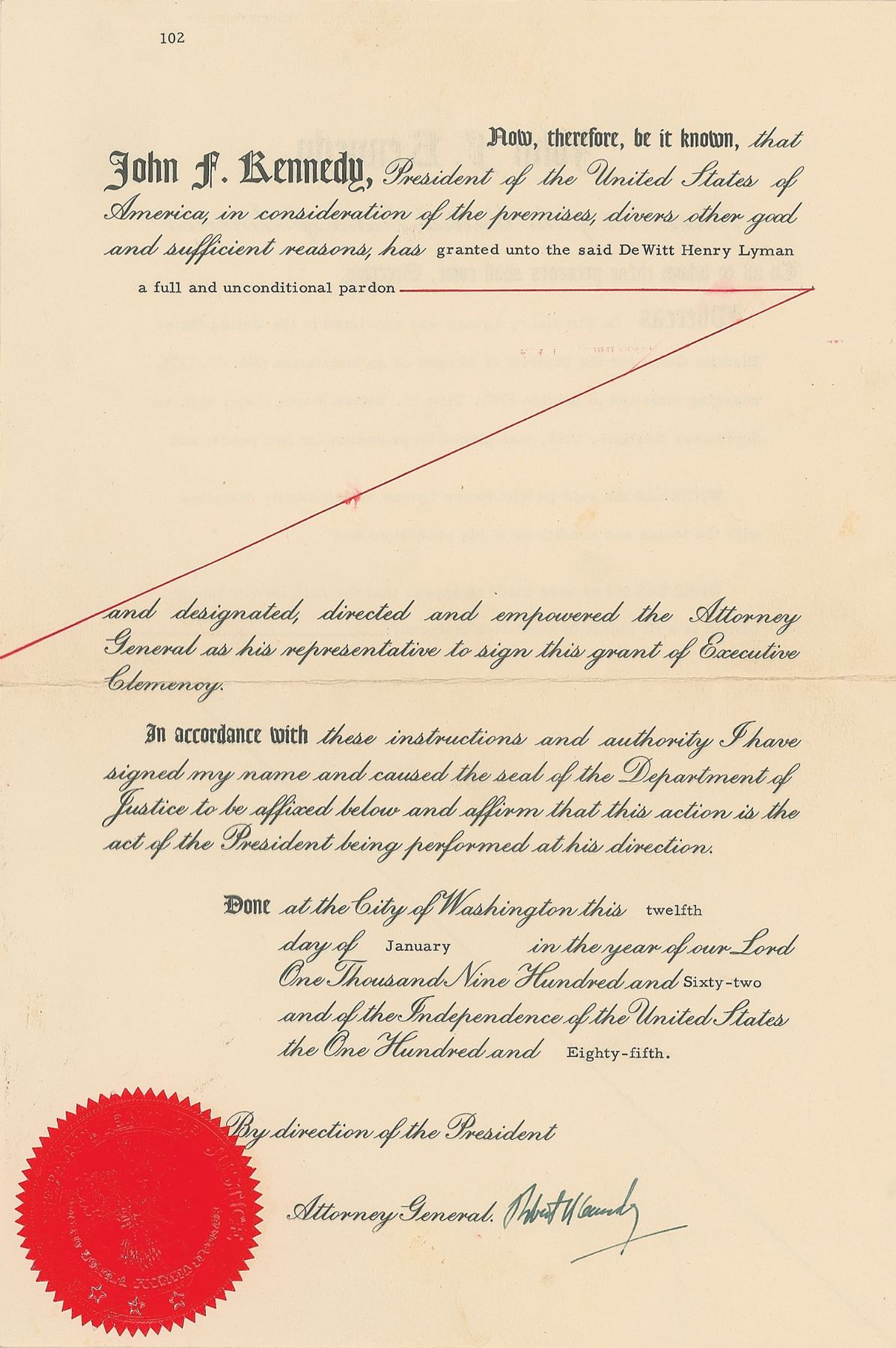 Uncommon DS, one page, 9 x 13.5, January 12, 1962. President John F. Kennedy grants DeWitt Henry Lyman "a full and unconditional pardon and designated, directed and empowered the Attorney General as his representative to sign this grant of Executive Clemency." Signed at the conclusion in fountain pen by Robert F. Kennedy. The red Justice Department seal remains affixed to the lower right. In fine condition, with a light crease to the upper left.