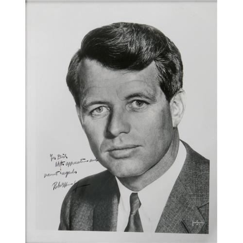 <B>Robert F. Kennedy Inscribed and Signed Photo.</B></I> An appealing 8" x 10" black and white, glossy image, nicely framed. Inscribed in black marker, slightly faded but very clear: "<I>To Dick with appreciation and best regards Robert F. Kennedy.</B></I>" A nice example of a scarce and popular subject.