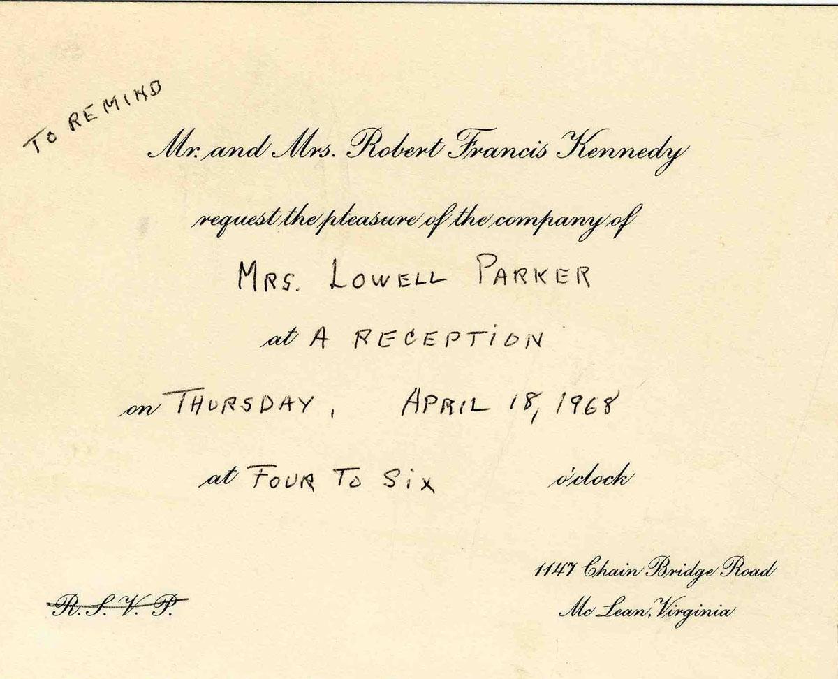 1968 invitation by Robert F. Kennedy to attend a reception at his home, scheduled less than two months before his assassination in Los Angeles. The invitation reads in engraved script and handwritten ink, ''Mr. and Mrs. Robert Francis Kennedy request the pleasure of the company of Mrs. Lowell Parker at a Reception on Thursday, April 18, 1968 at four to six o'clock / 1147 Chain Bridge Road, McLean, Virginia / R.S.V.P.'' Measures 5.75'' x 4.75''. Light soiling, else near fine.