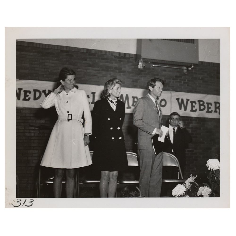 Original vintage semi-glossy 10 x 8 doubleweight silver gelatin photograph of Robert F. Kennedy beside his sister, Jean Kennedy Smith, while on the campaign trail in Utah in 1968. In fine condition. Credit to Gene Halford, a cropped version of this photograph was published in the April 5, 1968 issue of Time Magazine.