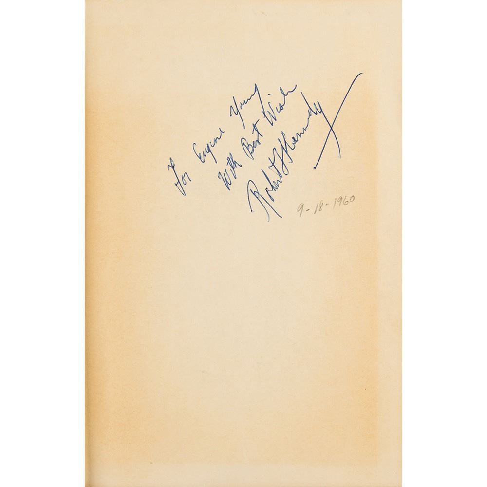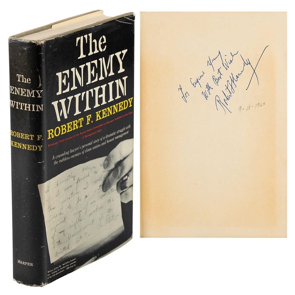 Signed book: The Enemy Within. Later printing. NY: Harper & Brothers, 1960. Hardcover with dust jacket, 6 x 8.5, 338 pages. Signed on the first free end page in blue ballpoint, "For Eugene Young, With Best Wishes, Robert F. Kennedy," dated "9-18-1960" in pencil below. In fine condition, with light wear to the dust jacket, and toning to the signed page.