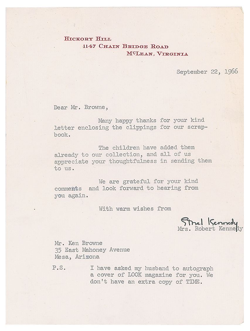 Cover removed from the August 23, 1966 issue of Look Magazine, 10.5 x 13.25, signed and inscribed in black felt tip, "For Mr. & Mrs. Ken Browne, With Best Wishes, Robert F. Kennedy." Includes a TLS by his wife, signed "Ethel Kennedy," one page, September 22, 1966, in part: "I have asked my husband to autograph a cover of LOOK magazine for you. We don't have an extra copy of TIME." In very good condition, with overall creasing, a central horizontal fold, and paper loss to the left side. Accompanied by the original mailing envelope for the Ethel Kennedy letter.