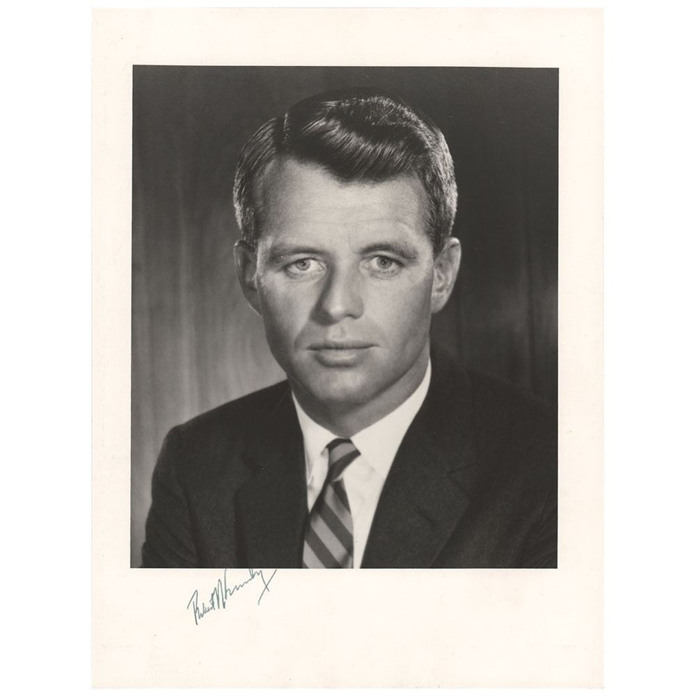 Handsome vintage matte-finish 7.25 x 9.75 portrait of Robert F. Kennedy in a suit and tie, signed in the lower border in fountain pen. In fine condition, with lightly trimmed edges, and a light paperclip impression to the top edge.