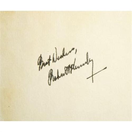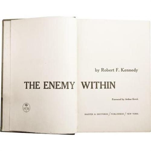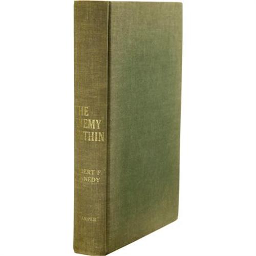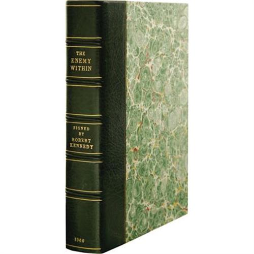 <B>Robert F. Kennedy: Signed <I>The Enemy Within</B></I>.</B></I> (New York: Harper & Brothers, 1960), 338 pages, olive green boards with gilt spine lettering, 8vo (5.75" x 8.5"), no dust jacket, clear plastic protective cover, housed in a fine custom green quarter leather slipcase with marbled paper boards, gilt spine lettering, and five raised spine bands. Signed "<I>Best Wishes, Robert F. Kennedy</B></I>" on the front free endpaper. <I>The Enemy Within,</B></I> subtitled in later editions as <I>The McClellan Committee's Crusade Against Jimmy Hoffa and Corrupt Labor Unions,</B></I> is RFK's account of the McClellan Committee's investigation of Hoffa and the Unions in the late 1950s. At the time, Kennedy was chief counsel of the Senate Labor Rackets Committee, better known as the McClellan Committee, and he was on a personal mission to bring down Hoffa, Johnny Dio, and any other Teamsters who might get in his way. Kennedy hated corruption anywhere at any level, and he was determined to "get Hoffa." <I>The Enemy Within</B></I> further soured an already bitter acrimony that both Kennedy and Hoffa felt for each other. But Kennedy's goal was noble and clear, and stated boldly at the end of Chapter 12 of this book where he writes, "The point I want to make is this: If we do not on a national scale attack organized crime with weapons and techniques as effective as their own, they will destroy us." The book presented here is in good condition, with minor shelf wear, some sunning to the spine, and slight fading of the spine lettering. The interior shows mild foxing of the endpapers, but the text is largely clean and the binding sound. A scarce chance to acquire a signed RFK book.<BR><BR><b>Shipping:</b> Books & Catalogs (<a target="_blank" href="http://www.heritageauctions.com/common/shipping.php">view shipping information</a>)