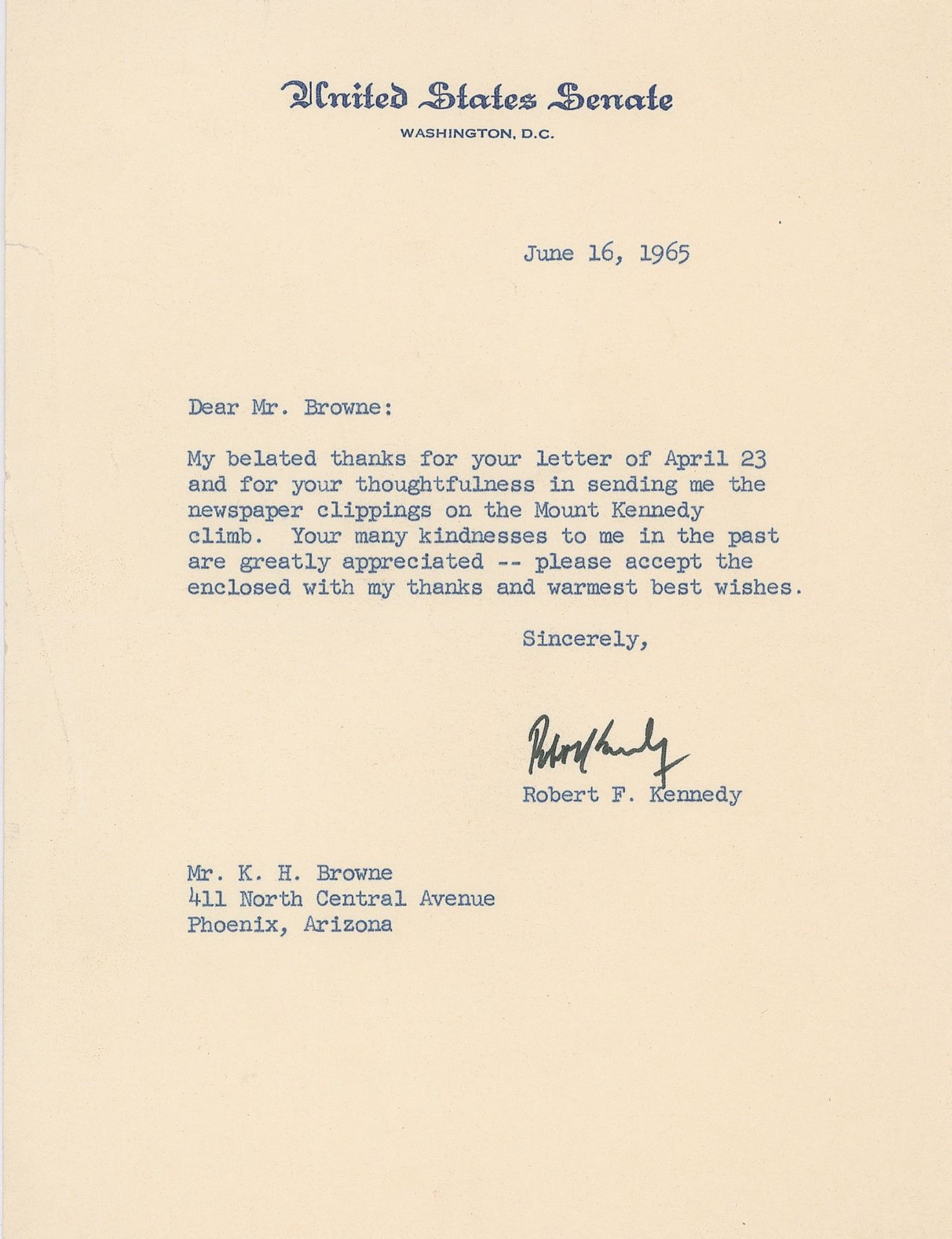 TLS, one page, 6 x 8, United States Senate letterhead, June 16, 1965. Letter to Ken Browne, in part: "My belated thanks for your letter of April 23 and for your thoughtfulness in sending me the newspaper clippings on the Mount Kennedy climb." In fine condition, with a light crease to the left side. A year after President John F. Kennedy's assassination, the Canadian government named a peak in the Yukon's Kluane National Park in his honor. Its first ascent was undertaken in 1965 by Robert F. Kennedy and a team of experienced mountaineers, and upon reaching the summit he left behind some of his brother's PT boat tie clips, a copy of his inaugural address, and a JFK medallion.