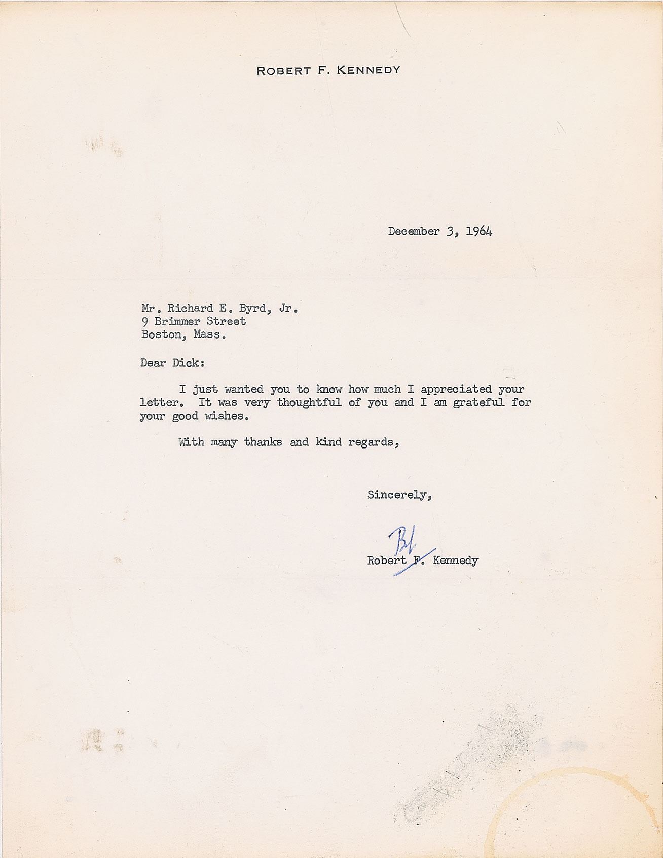 TLS signed "Bob," one page, 8.5 x 11, personal letterhead, December 3, 1964. Letter to Richard E. Byrd, Jr., son of the legendary explorer, in full: "I just wanted you to know how much I appreciated your letter. It was very thoughtful of you and I am grateful for your good wishes." In very good to fine condition, with stains to the blank bottom panel. Accompanied by a full letter of authenticity from JSA.