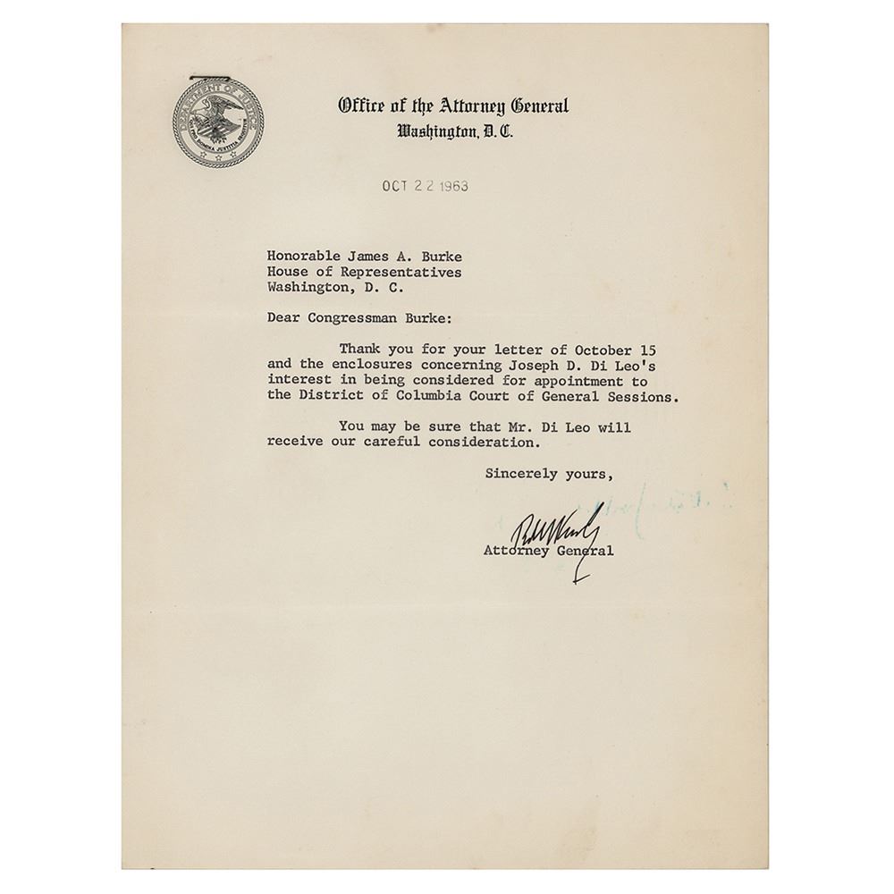 TLS, one page, 8 x 10.5, Office of the Attorney General letterhead, October 22, 1963. Letter to Massachusetts Congressman James A. Burke, in full: "Thank you for your letter of October 15 and the enclosures concerning Joseph D. Di Leo's interest in being considered for appointment to the District of Columbia Court of General Sessions. You may be sure that Mr. Di Leo will receive our careful consideration." In fine condition.