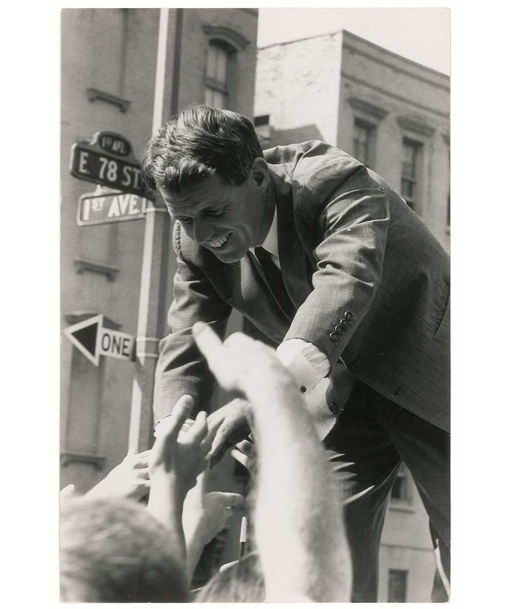 Original first-generation 6 x 9 semi-glossy photo of Robert Kennedy shaking hands with supporters on the corner of E 78th Street and 1st Avenue in Harlem during his 1960 senatorial campaign. In fine condition, with a small tear to top edge. Photo rights: The Lowenherz Collection of Kennedy Photographs.