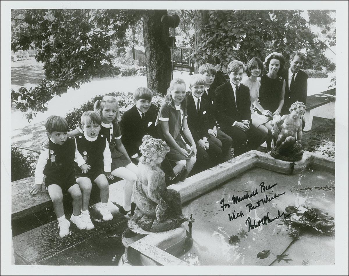 Vintage glossy 10 x 8 photo of Kennedy, his wife Ethel, and their nine children (at the time), most likely taken in the fall of 1966 at Hickory Hill, signed and inscribed in black felt tip “For Marshall Bean, with best wishes, Robert F. Kennedy.” In fine condition, with a few scattered light surface bends and creases. An attractive family portrait of the large, but not yet complete family. Kennedy’s tenth child, Douglas, was born on March 24, 1967; their eleventh child, Rory, was born on December 12, 1968, six months after her father’s assassination.