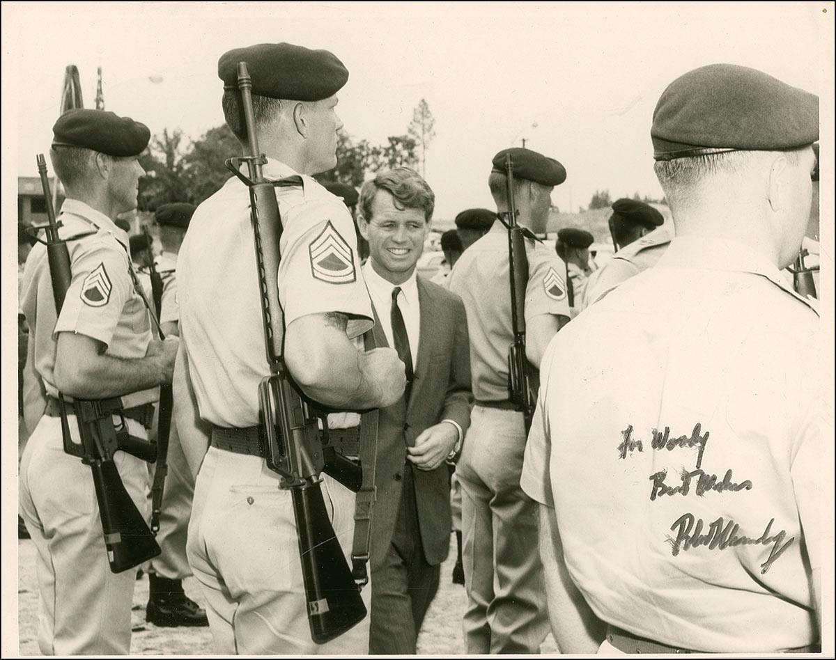 Vintage glossy 10 x 8 photo of Kennedy reviewing a line of soldiers, signed and inscribed in black felt tip “For Woody, Best wishes, Robert F. Kennedy.” In very good condition, with light brushes to signature and inscription, and scattered creases, mainly to upper portion of photo.