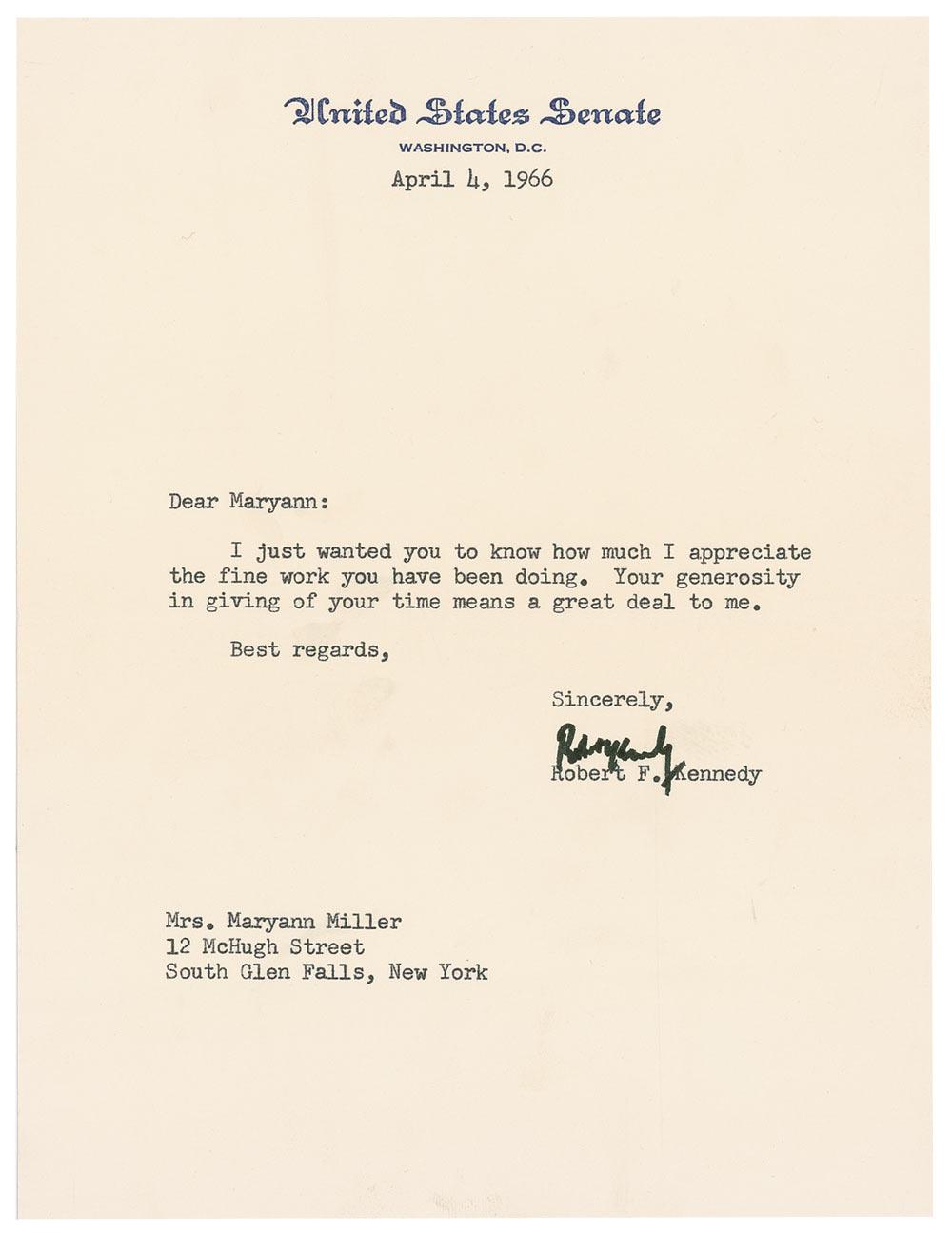 TLS, one page, 6.25 x 8, United States Senate letterhead, April 4, 1966. RFK writes Maryann Miller of South Glen Falls, New York. In full: “I just wanted you to know how much I appreciate the fine work you have been doing. Your generosity in giving of your time means a great deal to me.” In fine condition, with a few scattered bends and creases and a central horizontal fold. Accompanied by the original mailing envelope.
