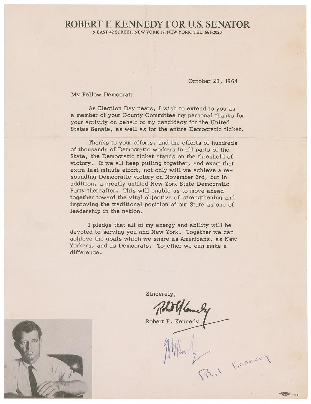 TLS signed in blue ballpoint “Robert F. Kennedy” and “Ethel Kennedy” beneath an autopen RFK signature, one page, 8.5 x 11, Robert F. Kennedy For US Senator letterhead, October 28, 1964. Printed form letter addressed to “My Fellow Democrats.” In part: “As Election Day nears, I wish to extend to you as a member of your County Committee my personal thanks for your activity on behalf of my candidacy for the United States Senate, as well as for the entire Democratic ticket…I pledge that all of my energy and ability will be devoted to serving you and New York. Together we can achieve the goals which we share as Americans, as New Yorkers, and as Democrats. Together we can make a difference.” Scattered soiling and wrinkling, otherwise fine condition.