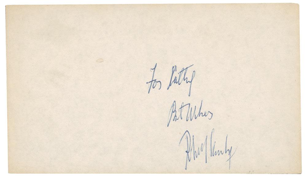 Blue ballpoint signature and inscription, “For Cathy, Best Wishes, Robert F. Kennedy,” on an off-white 5 x 3 sheet. Uniform toning, scattered creasing, and a tiny speck of soiling, otherwise fine condition.