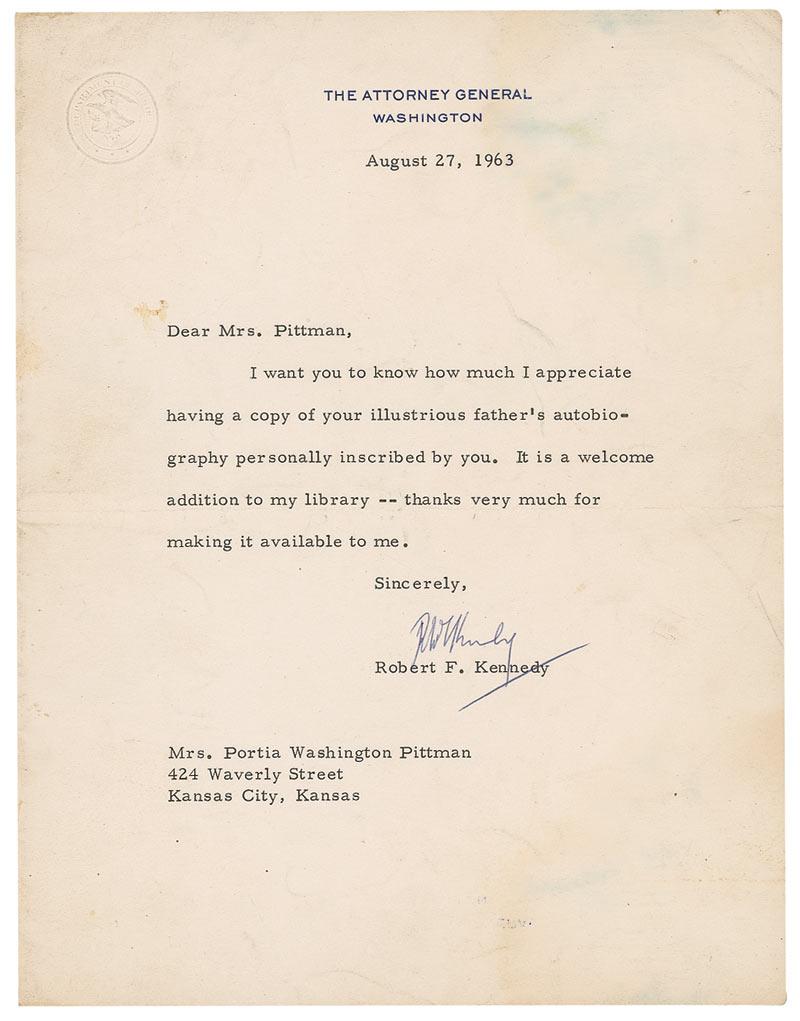TLS, one page, 7 x 9, Attorney General letterhead, August 27, 1963. Letter to Portia Pittman. In full: “I want you to know how much I appreciate having a copy of your illustrious father’s autobiography personally inscribed by you. It is a welcome addition to my library - - thanks very much for making it available to me.” In very good condition, with scattered creasing, toning, and soiling.