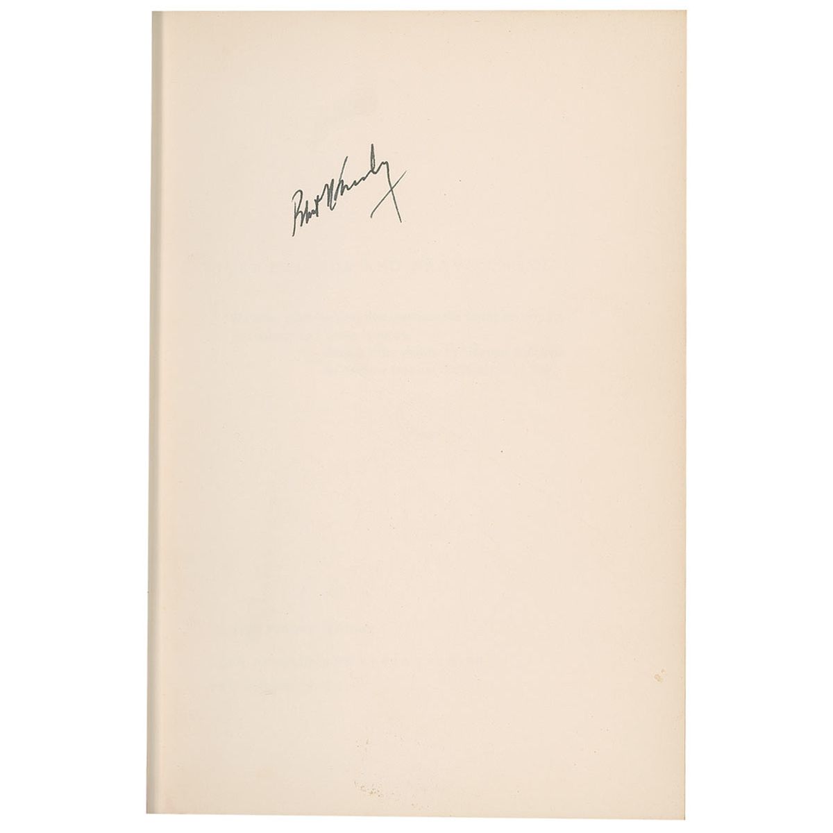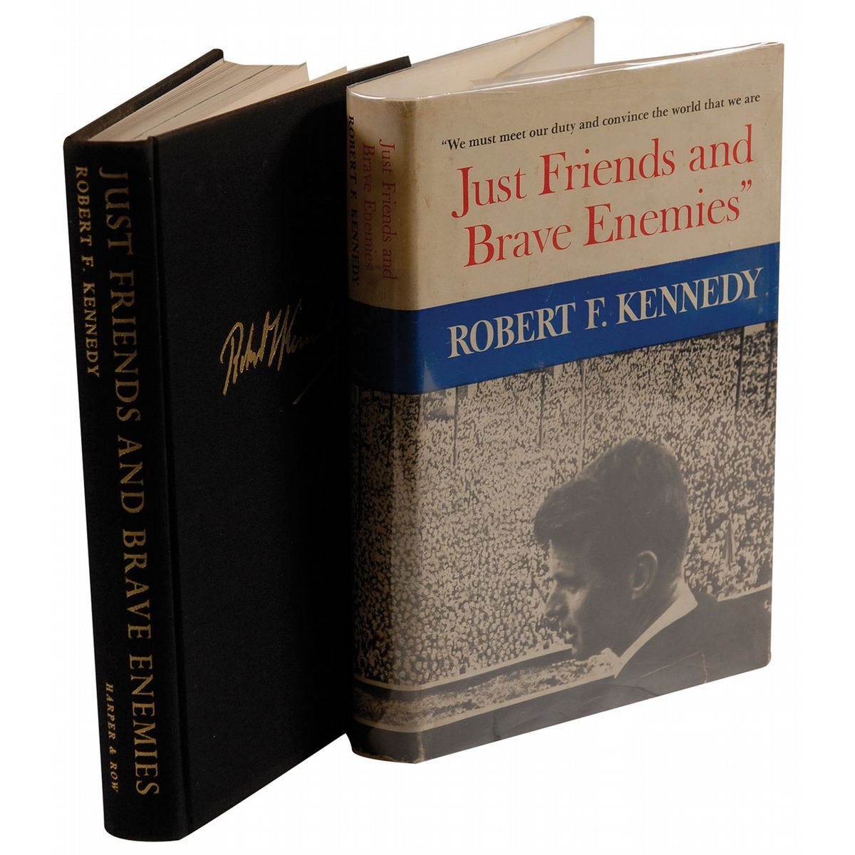 Signed book: Just Friends and Brave Enemies. First edition. NY: Harper & Row, Publishers, 1962. Hardcover with dustjacket, 6 x 8.5, 211 pages. Signed in black ink on the first free end page, “Robert F. Kennedy.” Light spots of toning on the pastedown and signature pages, loose, but intact hinge, and wear and creasing to the dustjacket, otherwise fine condition.