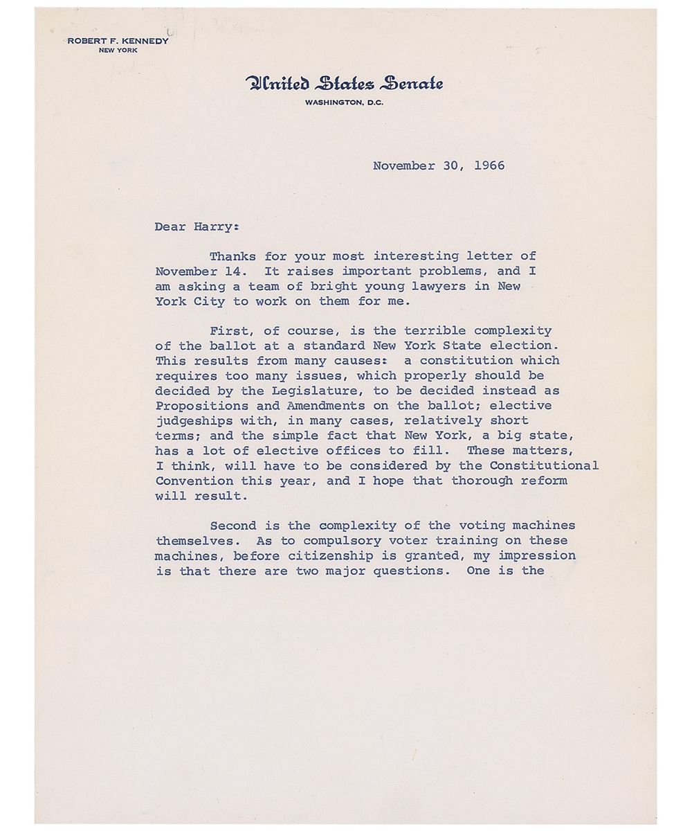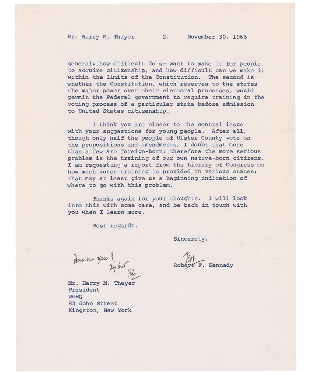 As a senator from New York, Kennedy became familiar with WGHQ’s president Harry Thayer, an outspoken radio personality known as the ‘Voice of the Hudson Valley.’ Highly involved in community affairs and never hesitant to speak his mind, Thayer frequently contacted politicians with his opinions, ideas, and hopes for the future of New York. After the passage of the Voting Rights Act of 1965, which eliminated previously legal strategies to prevent blacks and other minorities from voting, the grounds were set; now it was the logistics of voting that needed work. With his long-standing belief that voting was the key to racial equality, Kennedy was passionate about reforming the system. Acknowledging the difficulties in voting—the complexity of the ballots with their multitude of issues and appointments, the complexity of the voting machines, and the lack of training citizens how to effectively participate—RFK expresses hope for future reforms in these areas, as well as gratitude for the concerned radio host’s input. A lively reply to a well-known New York radio figure, this letter addresses important voting issues that remain relevant even today.