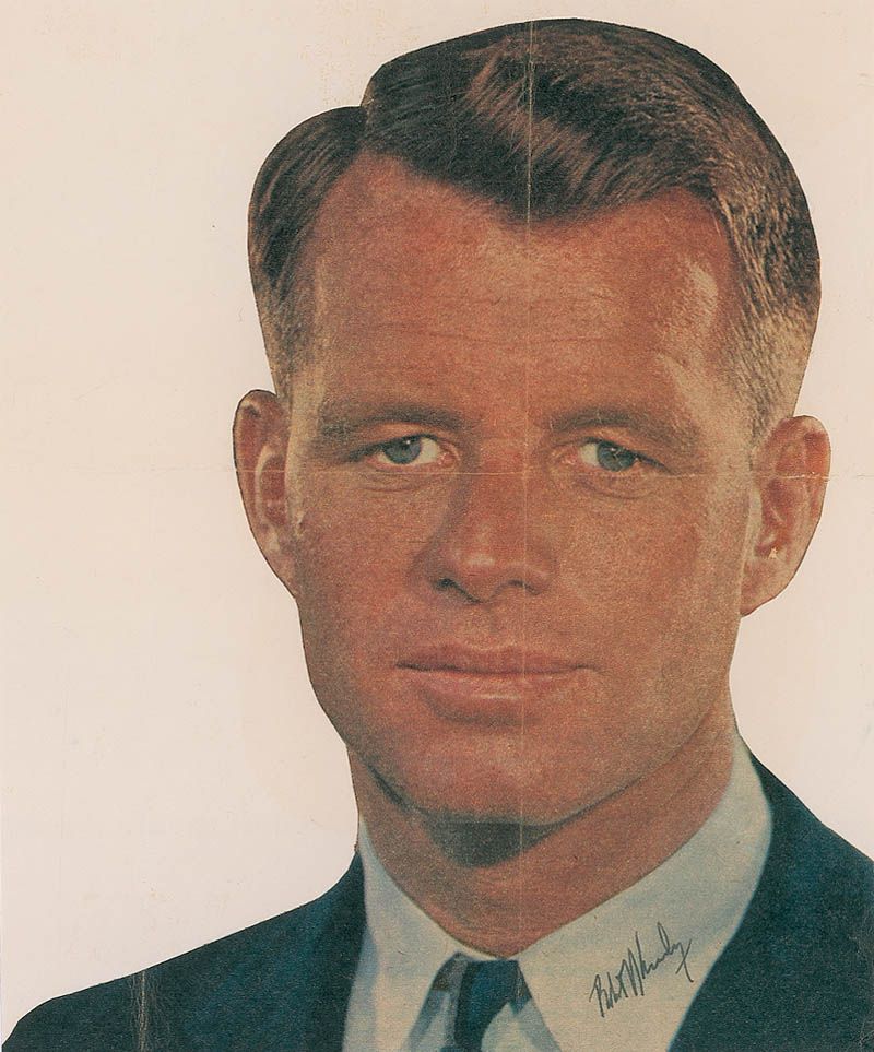 Closely trimmed color vintage magazine photo, affixed to a 7.25 x 9 off-white sheet, signed on the image in black ink. In fine condition, with central horizontal and vertical fold through image, with a few extra folds to sheet. Accompanied by a March 2, 1962, letter from the Special Assistant for Public Information of the Department of Justice.