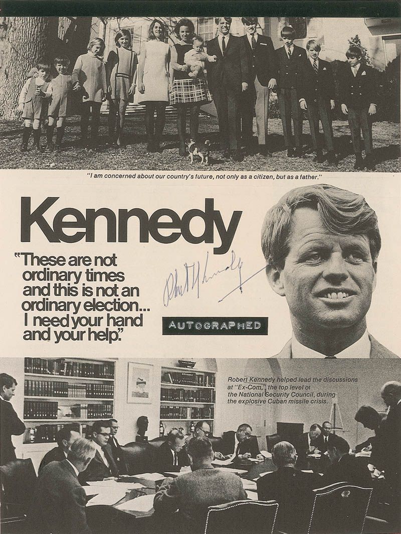 Page from a campaign brochure, 8 x 10.5, featuring a portrait of Kennedy between images of his family and him at work, signed in the center in blue ballpoint. Affixed at the top to a same-size cardstock sheet. In very good condition, with two horizontal folds and a Dymo label affixed below the signature.